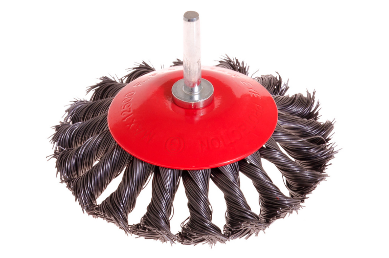 Щітка конусна з плетеними дротом для дрилі. Призначена для робіт по дереву, бетону, металу і лакофарбовим покриттям. Діаметр щітки 100 мм, стрижня - 6 мм. Швидкість обертання: 4500 об/хв