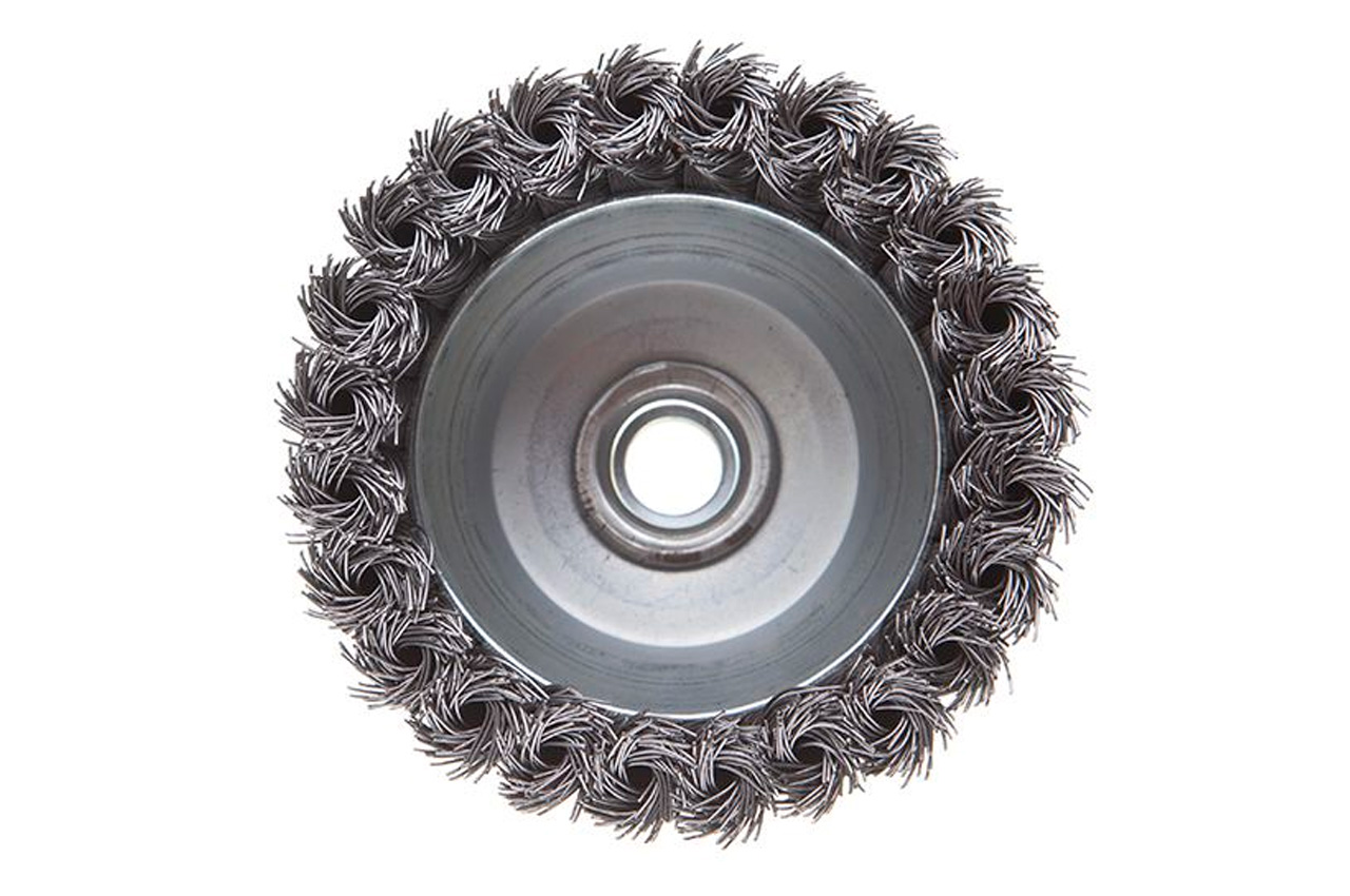 Щітка торцева (чашкова) з плетеними дротом для УШМ. Призначена для робіт по дереву, бетону, металу і лакофарбовим покриттям. Діаметр 100 мм. Швидкість обертання: 8500 об / хв Тип дроту: плетена проволока; Швидкість обертання: 8500 об / хв; Діаметр щітки: 100 мм; Діаметр дроту: 0,5 мм; Тримач: М14; Застосування: для дерева, бетону, металу і лакофарбових покриттів