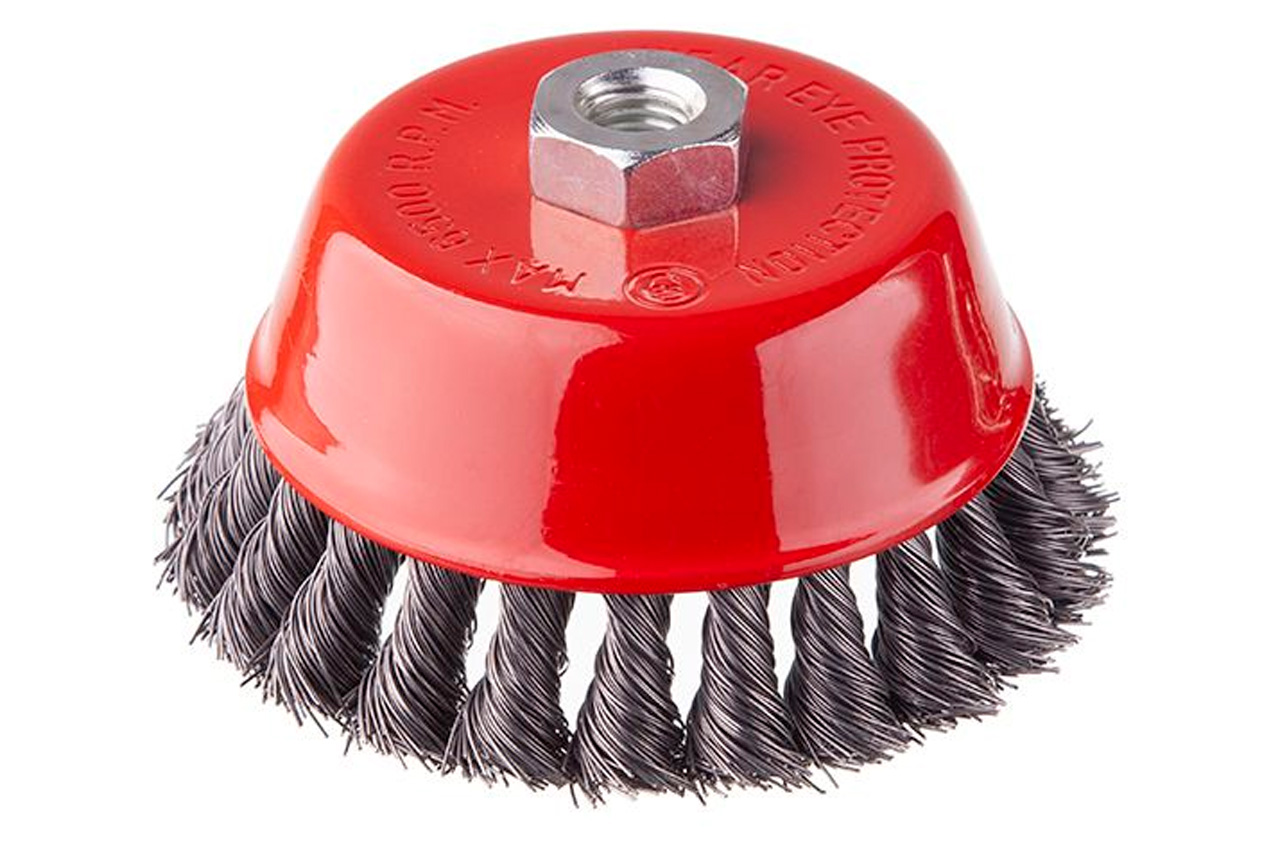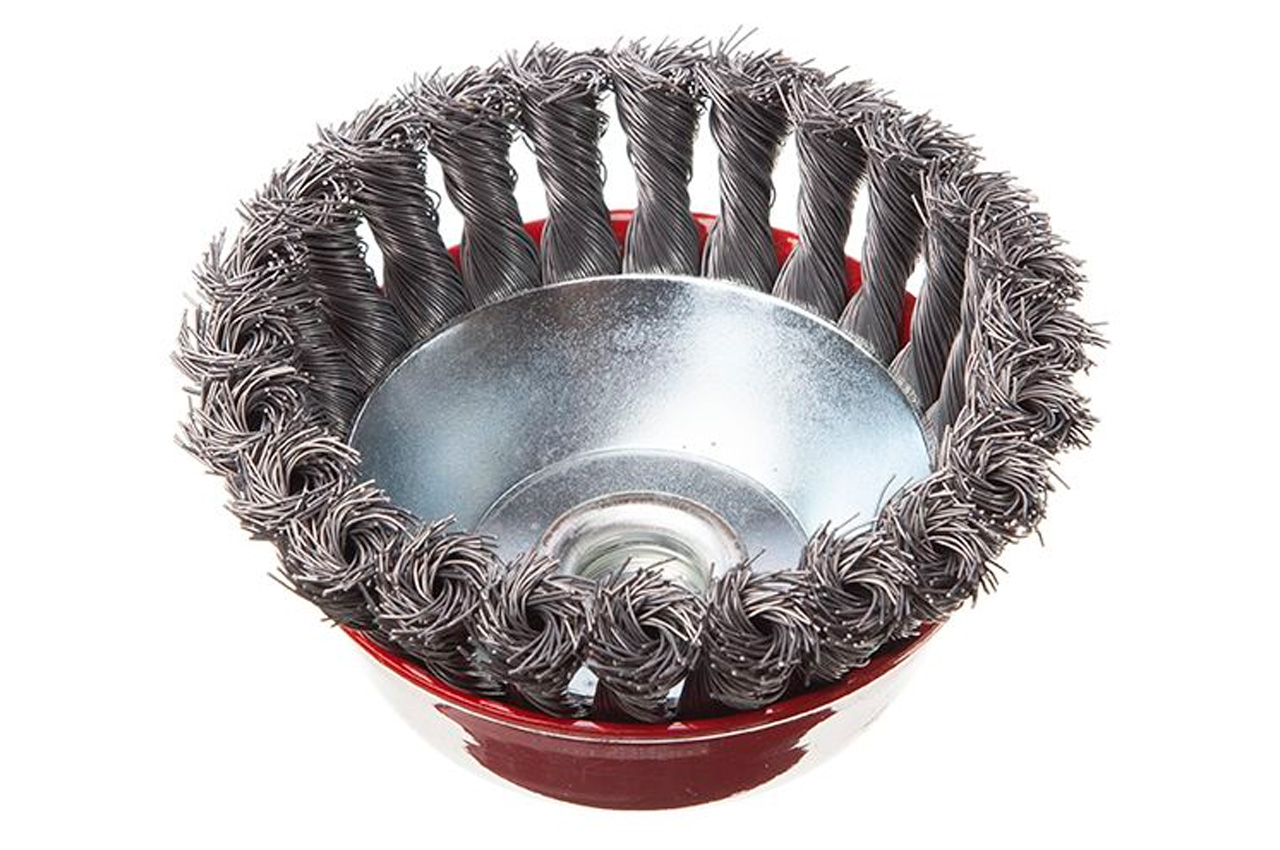 Щітка торцева (чашкова) з плетеними дротом для УШМ. Призначена для робіт по дереву, бетону, металу і лакофарбовим покриттям. Діаметр 125 мм. Швидкість обертання: 6500 об / хв. Тип дроту: плетена проволока; Швидкість обертання: 6500 об / хв; Діаметр щітки: 125 мм; Діаметр дроту: 0,5 мм; Тримач: М14; Застосування: для дерева, бетону, металу і лакофарбових покриттів