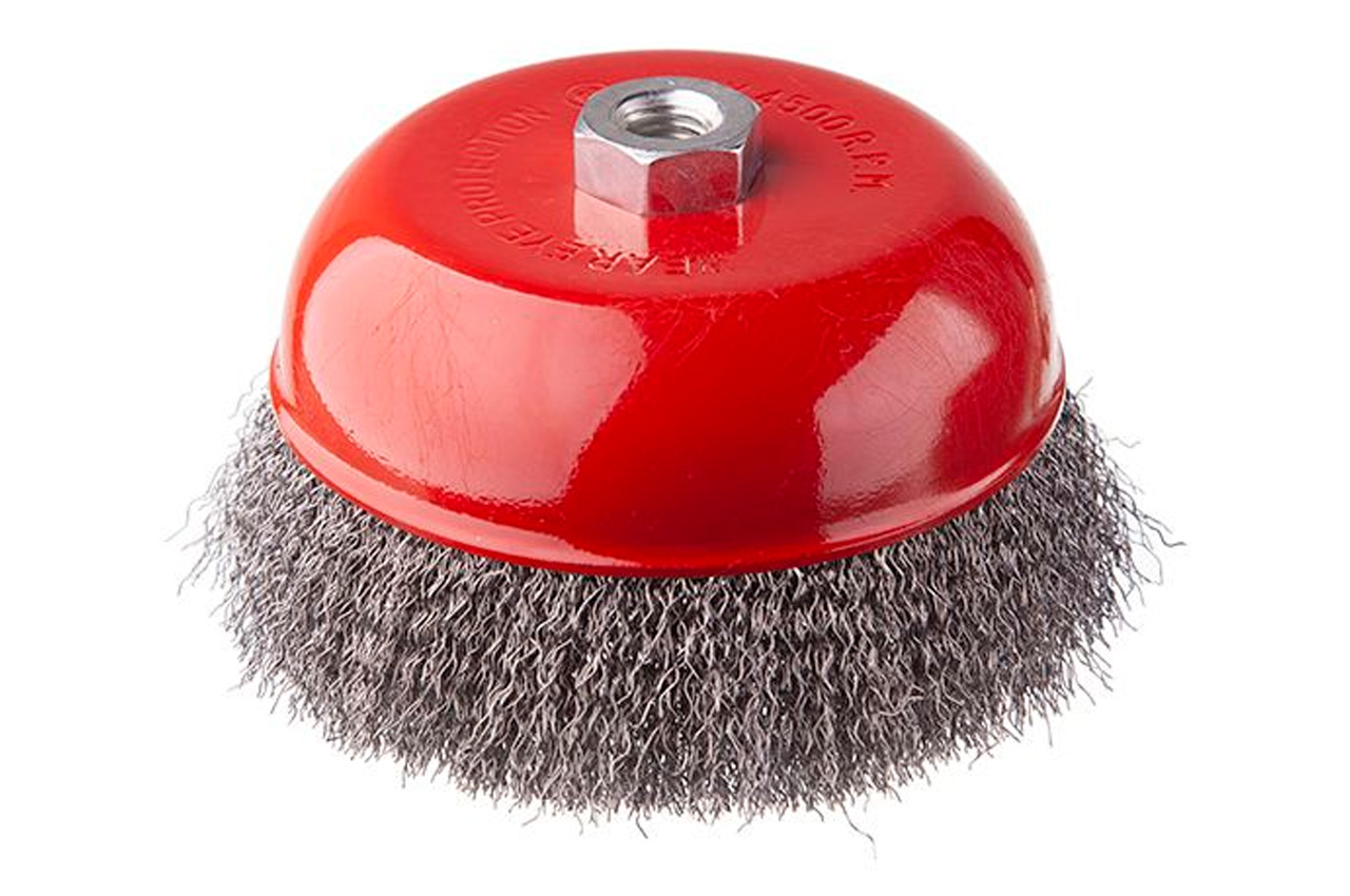 Щітка торцева (чашкова) з рифленою дротом для УШМ. Призначена для робіт по дереву, бетону, металу і лакофарбовим покриттям. Діаметр 150 мм. Швидкість обертання: 4500 об / хв Тип дроту: рифлена дріт; Швидкість обертання: 4500 об / хв; Діаметр щітки: 150 мм; Діаметр дроту: 0,3 мм; Тримач: М14; Застосування: для дерева, бетону, металу і лакофарбових покриттів