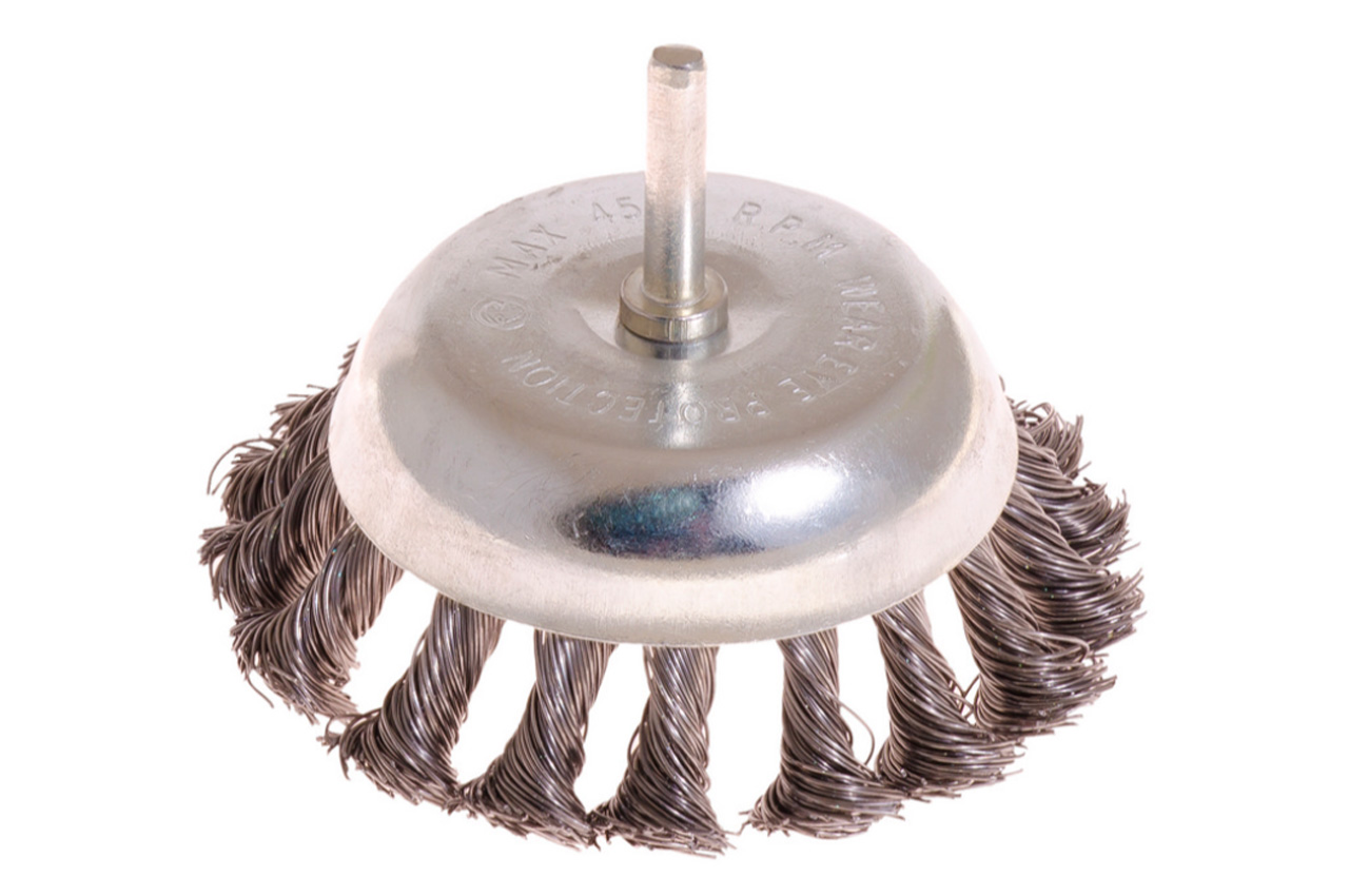 Щітка торцева з плетеної дротом для дрилі. Призначена для робіт по дереву, бетону, металу і лакофарбовим покриттям. Діаметр щітки 100 мм, стрижня - 6 мм. Швидкість обертання: 4500 об/хв