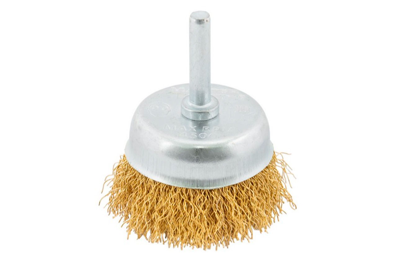 Щітка торцева з рифленою дротом для дрилі. Призначена для робіт по дереву, бетону, металу і лакофарбовим покриттям. Діаметр щітки 50 мм, стрижня - 6 мм. Швидкість обертання: 4500 об/хв