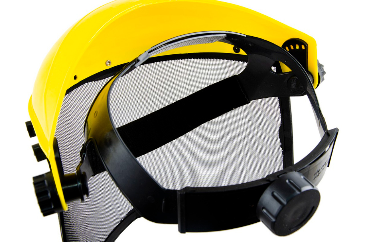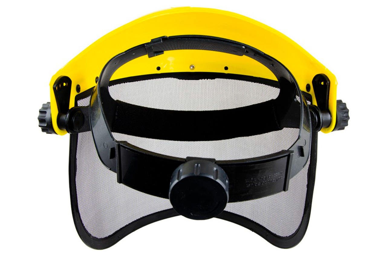 Щиток сітка для газонокосильщика. Екран з дрібної металевої сітки. Козирок для захисту лобової частини голови. Регульоване кріплення.