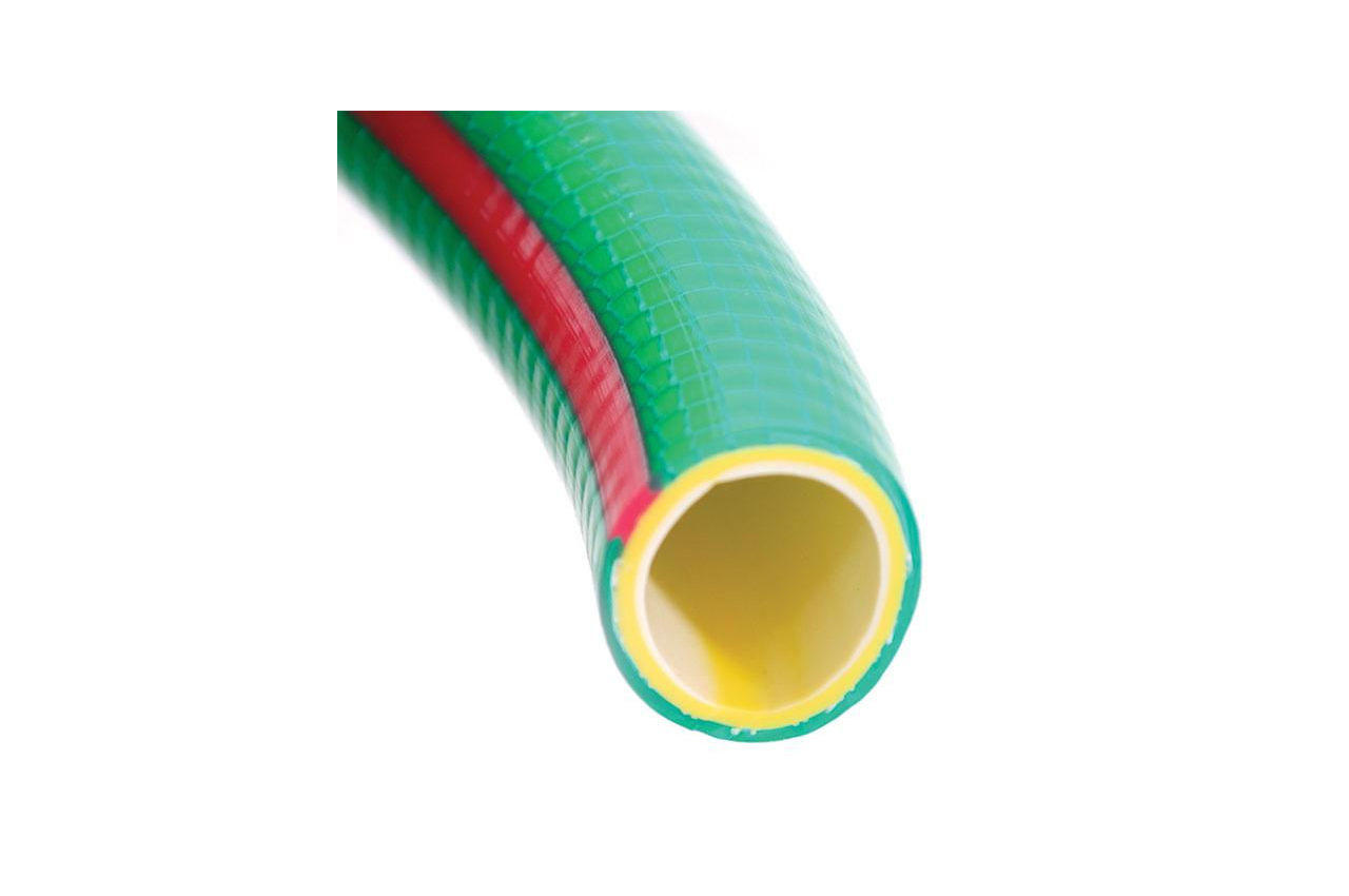 Шланг армований використовується для поливу городу, саду, тощо. Має багатошарову структуру та включає три міцні шари. Шланг виготовлений з полівінілхлориду з шаром армування синтетичною ниткою. Ця вставка посилює структуру матеріалу та дозволяє витримувати тиск до 5 атм. Виготовлений з п’ятишарового ПВХ матеріалу, з армованим обплетенням. Завдяки особливій технології армування з сітчастим плетінням шланг не розтягується під тиском, а діаметр не змінюється з часом. Такий садовий шланг витримує мороз до -10°C, а також екстремальну спеку до +60°C