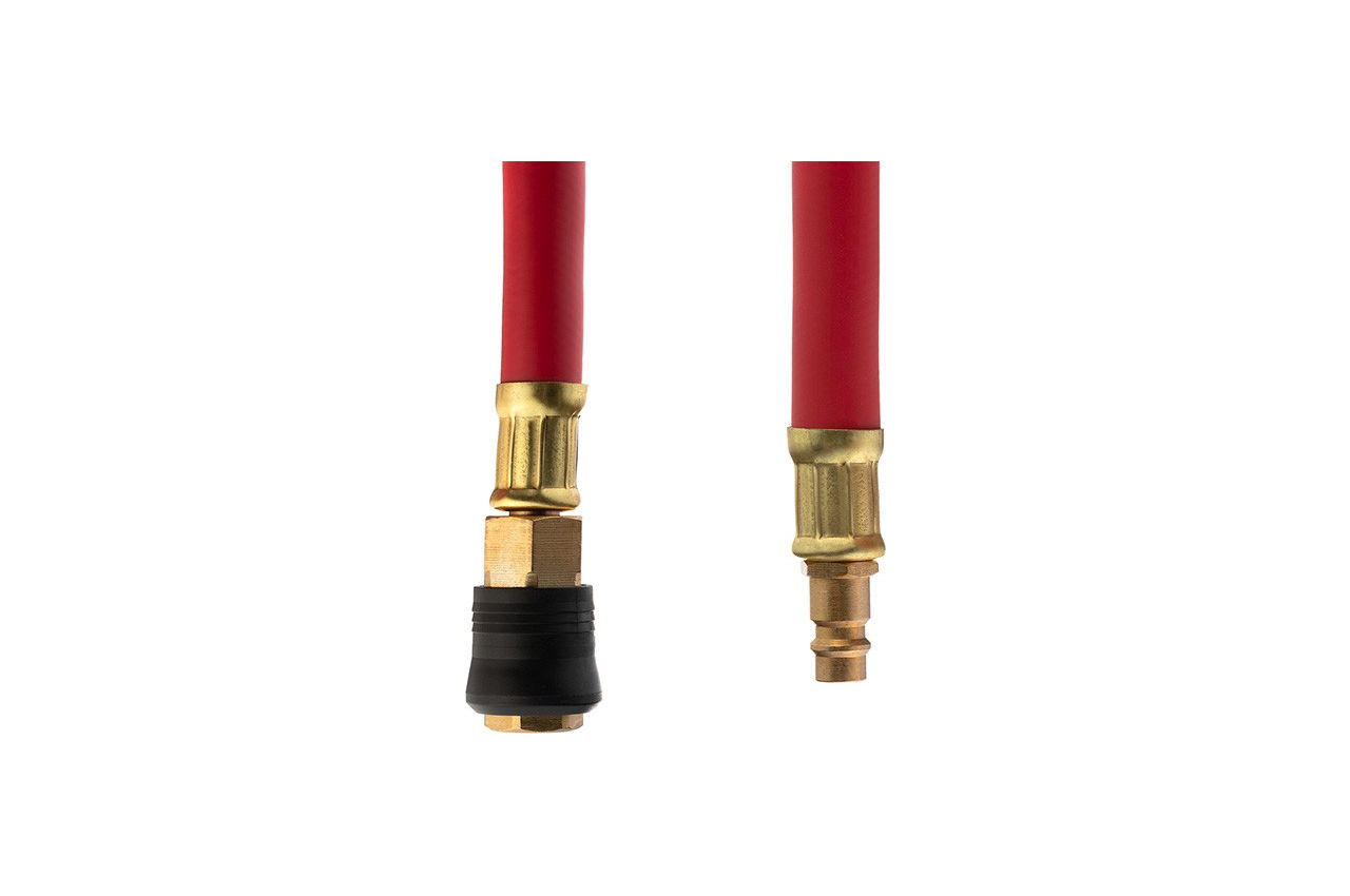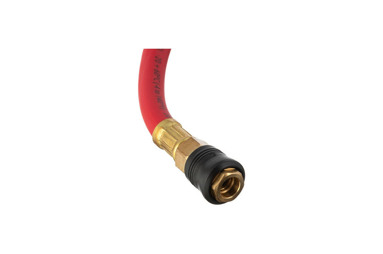 Шланг виготовлений з армованого гібридного складу і зібрав в собі кращі властивості гуми і полівінілхлориду. Спеціальна формула сировини, з якого виготовляються шари шланга, роблять його еластичним, при цьому стійким до низьких і високих температур, зносостійким, маслостойкостью. Гібридні шланги стійкі до зламів і механічних пошкоджень. Міцне армування і товсті стінки шланга забезпечує роботу шланга з тиском повітря до 20 атм. Всі шланги оснащені латунними швидкороз'ємними сполуками, які мають ряд переваг перед сталевими, такі як довговічність, стійкість до корозії, більший термін експлуатації і т.д. Переваги: Тришаровий еластичний, зносостійкий. Стійкий до впливу масел і вологи. Тиск до 20 атм. Температура експлуатації від -20 ° С до + 60 ° С. Латунні швидкороз'ємні з'єднання. Модель PT-1 761 PT-1 762 PT-тисячу сімсот шістьдесят три PT-тисяча сімсот сімдесят один PT-1 772 PT-1773 PT-один тисячу сімсот вісімдесят один PT-1782 PT-тисячі сімсот вісімдесят-три Довжина, м 10 20 30 10 20 30 10 20 30 Діаметр, мм 6 * 11 6 * 11 6 * 11 8 * 15 8 * 15 8 * 15 10 * 17 10 * 17 10 * 17 сполуки швидко (латунь) + + + + + + + + + Довжина шланга: 10 м; Діаметр шланга: 10 * 17 мм; Робочий тиск: до 20 бар; Температура зовнішнього середовища: від -20 до +60 ° С