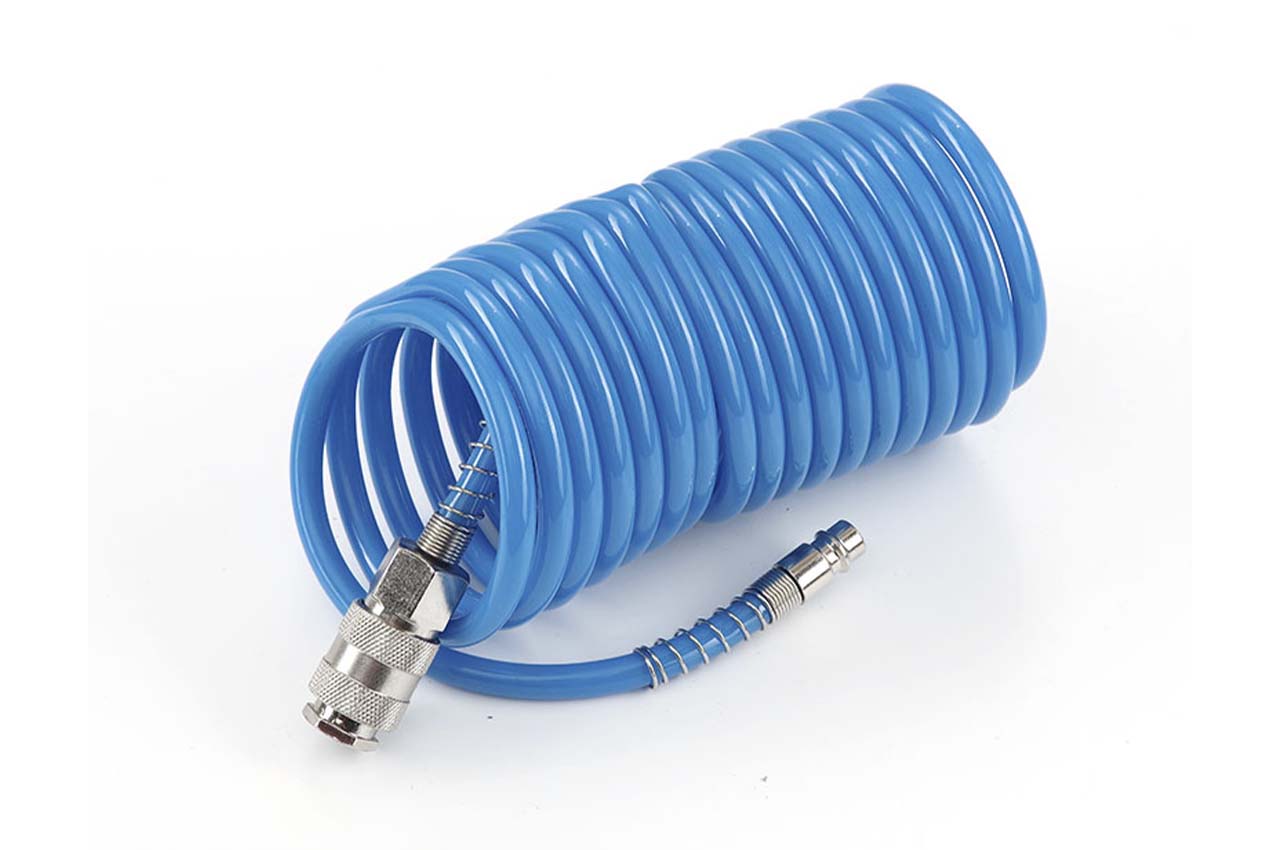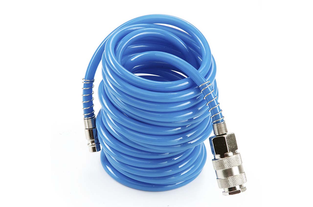 Шланг спіральний Apro - призначений для подачі стисненого повітря від компресора до пневмоінструменту. Завдяки поліуретановому матеріалу, виріб відрізняється підвищеною еластичністю та міцністю. Шланг не схильний до гідролізу і має хорошу стійкість до впливу озону і мікроорганізмів. Шланг має довжину 15 метрів і укомплектований двома швидкознімними перехідниками 6,5 x 10 мм.