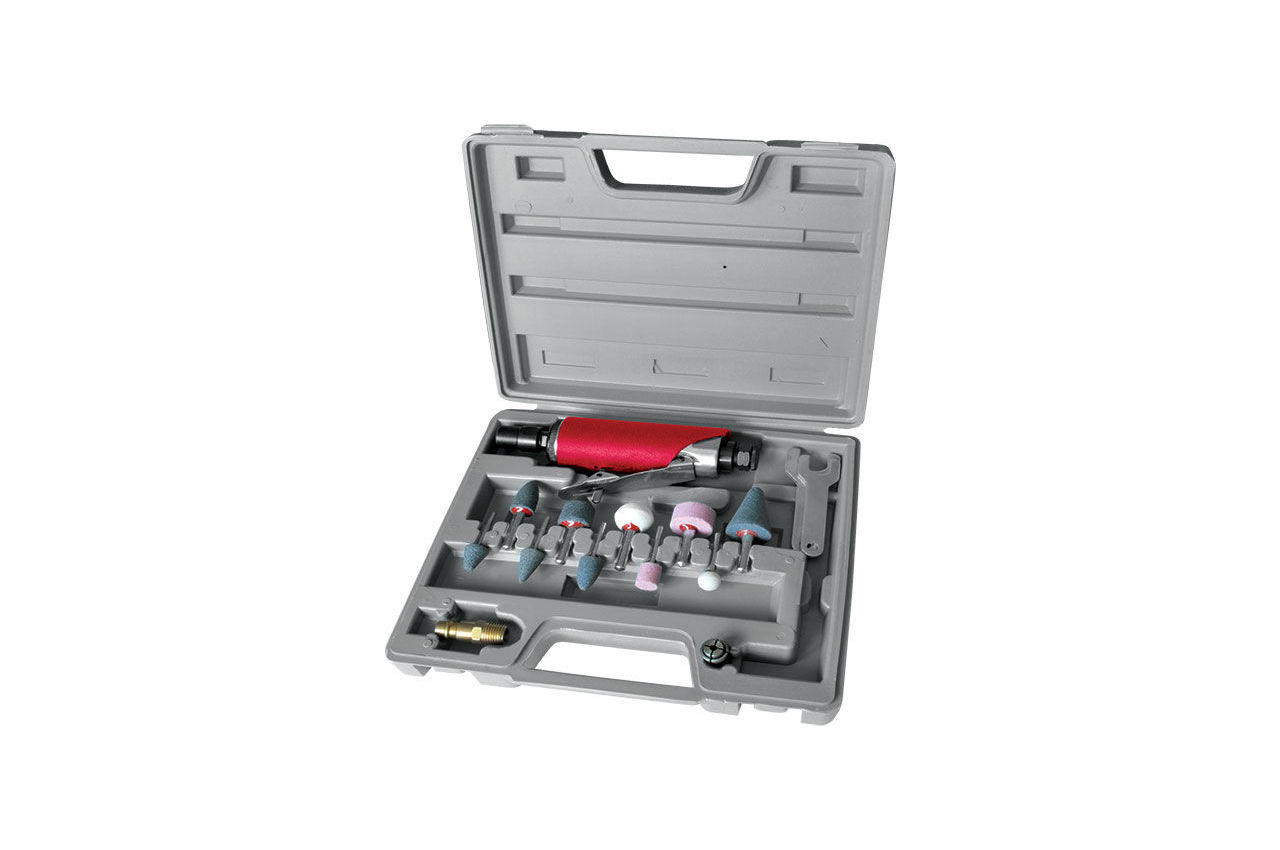 Пневматична шліфувальна машина використовується з усіма видами насадок для свердління отворів, очищення зварних швів, зачистки гострих країв, зняття кромки, полірування і шліфування. Для зручності в роботі з даним інструментом має задній вихід повітря. Алюмінієвий корпус надає конструкції легкість і міцність. Для забезпечення додаткової безпеки конструкцією шліфувальні машини передбачена запобіжна засувка важеля. Шліфмашина поставляється в пластиковому кейсі з набором шліфувальних каменів. Ергономічний дизайн даної моделі і наявність обрезиненной рукоятки роблять роботу з інструментом комфортною і легкою. Робочий тиск: до 6 атм; Швидкість обертання: 25000 об / хв; Витрата повітря: 115 л / хв; Діаметр шланга: 8-10 мм; Цанговий затиск: 63 мм; Комплектація: 10 шліфувальних каменів + пластиковий чемодан