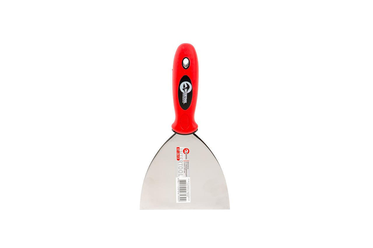 Шпатель професійної серії KT-2613 призначений для фасадних і внутрішніх обробно-ремонтних робіт. Полотно шпателя виконано з якісної нержавіючої сталі, яка гарантує надійність і довговічність інструменту, а також легко чиститься і миється. Шпатель володіє посиленою двухкомпонентной ручкою з гуми і пластика. Вона має ергономічну форму, комфортно лежить в руці і забезпечує надійне захоплення. Шпатель оснащений алюмінієвим профілем, який надає додаткову міцність конструкції і забезпечує рівність полотна під час проведення робіт. Розмір зубів: без зубів; Ширина шпателя: 125 мм