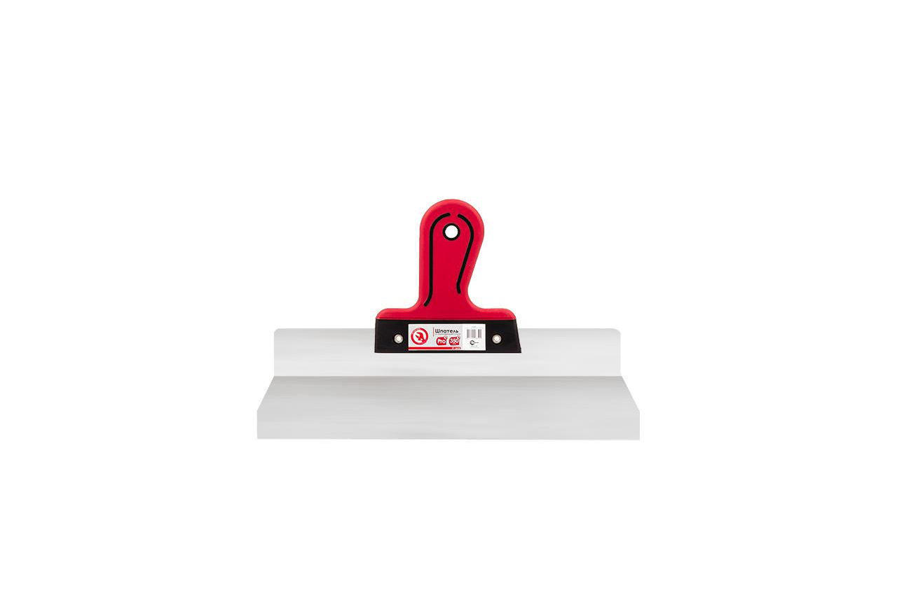 Шпатель професійної серії KT-2635 призначений для фасадних і внутрішніх обробно-ремонтних робіт. Полотно шпателя виконано з якісної нержавіючої сталі, яка гарантує надійність і довговічність інструменту, а також легко чиститься і миється. Шпатель володіє посиленою двухкомпонентной ручкою з гуми і пластика. Вона має ергономічну форму, комфортно лежить в руці і забезпечує надійне захоплення. Шпатель оснащений алюмінієвим профілем, який надає додаткову міцність конструкції і забезпечує рівність полотна під час проведення робіт. Розмір зубів: без зубів; Ширина шпателя: 350 мм