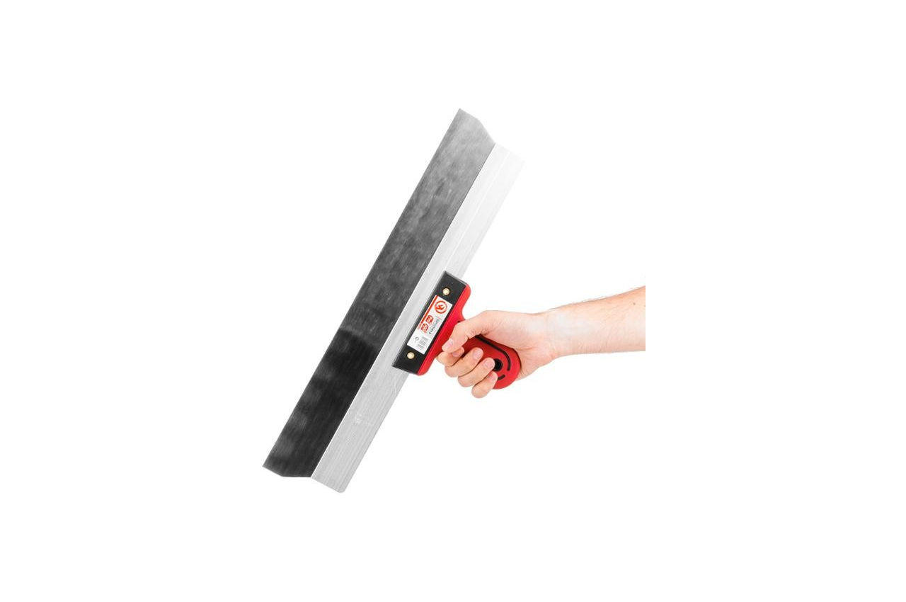 Шпатель професійної серії KT-2650 призначений для фасадних і внутрішніх обробно-ремонтних робіт. Полотно шпателя виконано з якісної нержавіючої сталі, яка гарантує надійність і довговічність інструменту, а також легко чиститься і миється. Шпатель володіє посиленою двухкомпонентной ручкою з гуми і пластика. Вона має ергономічну форму, комфортно лежить в руці і забезпечує надійне захоплення. Шпатель оснащений алюмінієвим профілем, який надає додаткову міцність конструкції і забезпечує рівність полотна під час проведення робіт. Розмір зубів: без зубів; Ширина шпателя: 500 мм