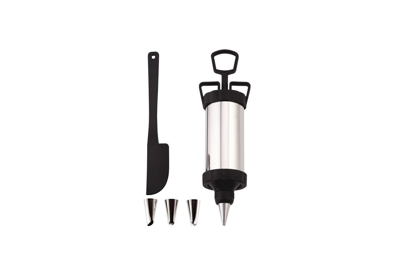 Шприц кондитерський Empire ємністю 220 мл знадобиться для швидкого приготування желе з так званим акваріумних ефектом. Маються на увазі декоративні елементи різних форм і відтінків в піалі з вмістом. Це можуть бути пелюстки рослин, реалістичні бутони троянд або, наприклад, фігурки тварин з кумедними мордочками. У наборі - 10 насадок з нержавійки, з допомогою яких можна «малювати» картини прямо в харчовому розчині. Середня довжина голок різної конфігурації - 25 мм.