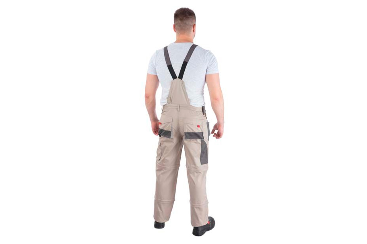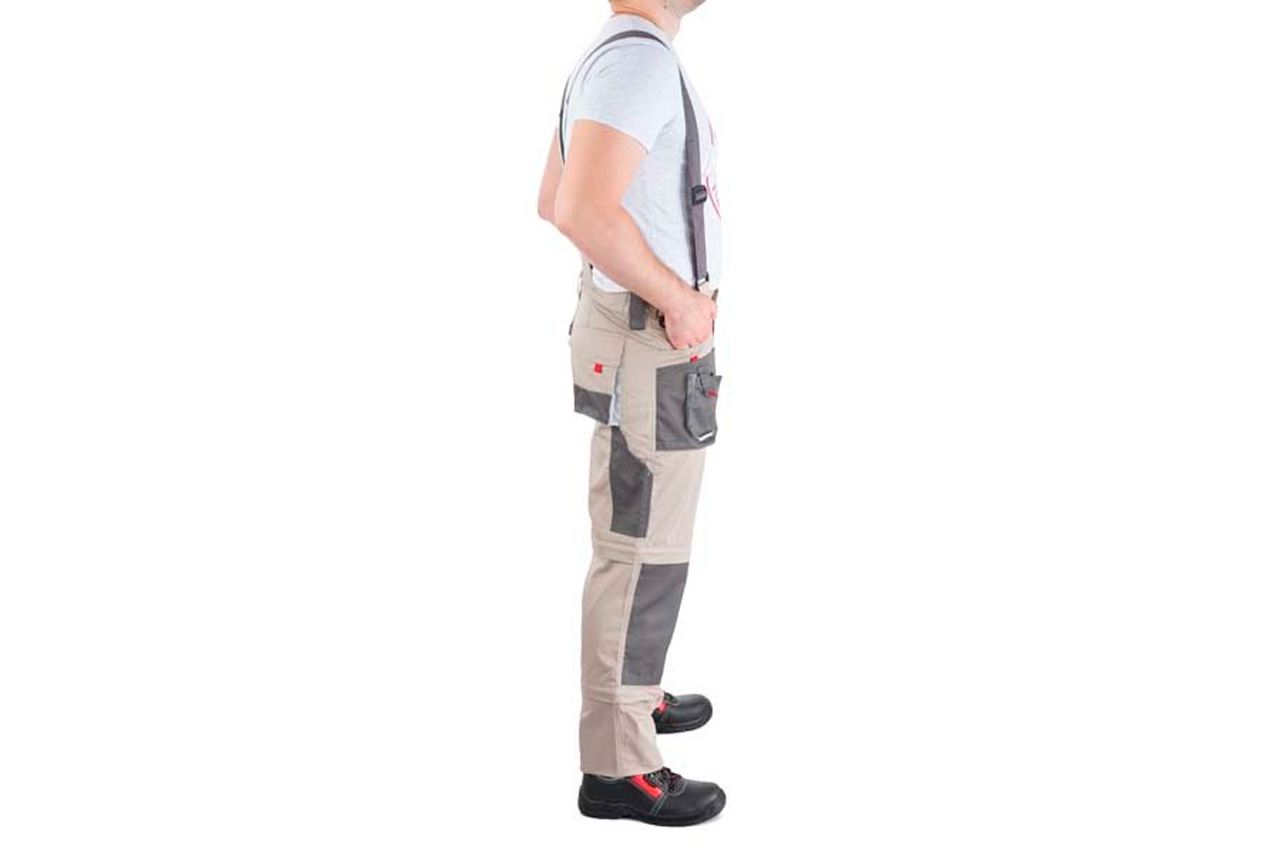 Багатофункціональні брюки бежевого кольору мають унікальну конструкцію, завдяки чому можуть трансформуватися в напівкомбінезон, брюки, бриджі, шорти з лямками і без них. Така універсальність моделі дозволяє носити їх як влітку, так і в інші сезони. Виготовлені штани з 100% бавовни, пропускають повітря і приємні до тіла. Щільність тканини становить 180 г / м², відмінно захищає від різних механічних пошкоджень. Трансформуються в шорти, бриджі, брюки і напівкомбінезон з лямками і без них 9 функціональних кишень для зберігання інструменту і особистих речей. Два основних кишені посилені додатково тканиною проти зносу Комфортний, легкий матеріал виготовлення Регульовані лямки з вставкою з еластичної резинки для налаштування необхідного розміру Посилені шви підвищують міцність виробу Вставки під наколінники з чорної міцної тканини