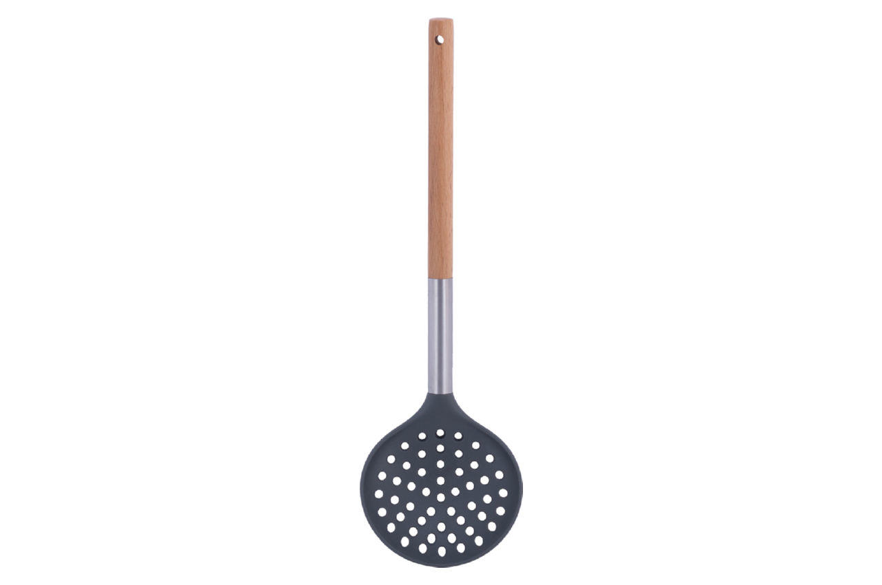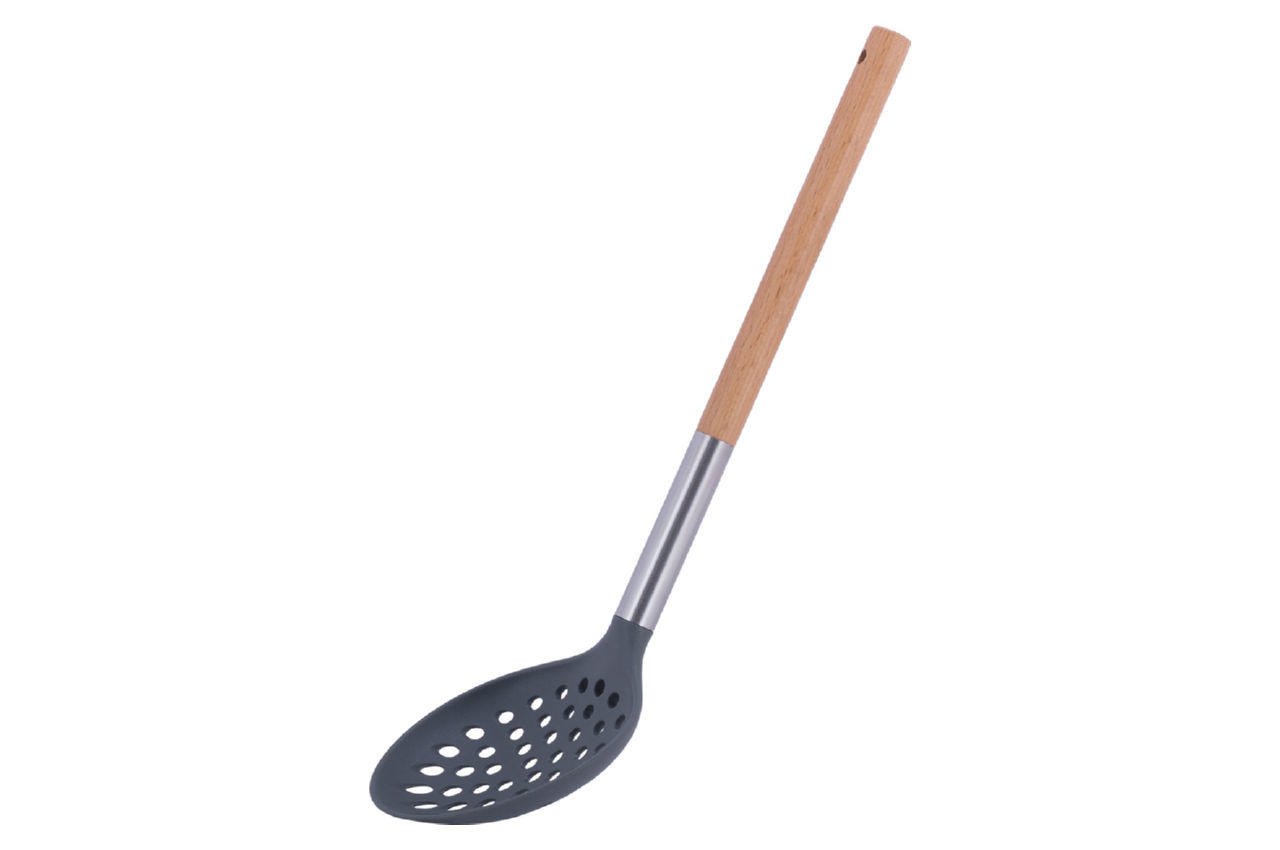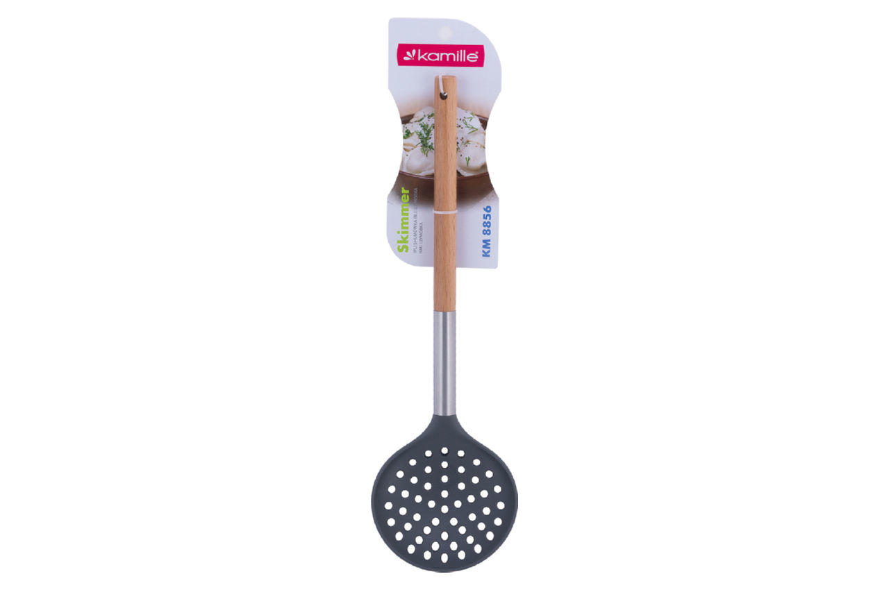Кухарська ложка Kamille – чудовий помічник на кухні, а її стильний дизайн неодмінно підійде до інтер'єру Вашої кухні. Матеріал робочої частини: нейлон. Матеріал ручки: нержавіюча сталь, дерево. Розмір: 35*10,2 див. Довжина ручки: 24см. Довжина робочої частини ручки: 16,5