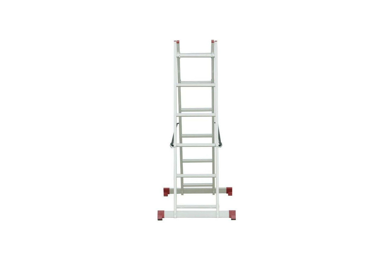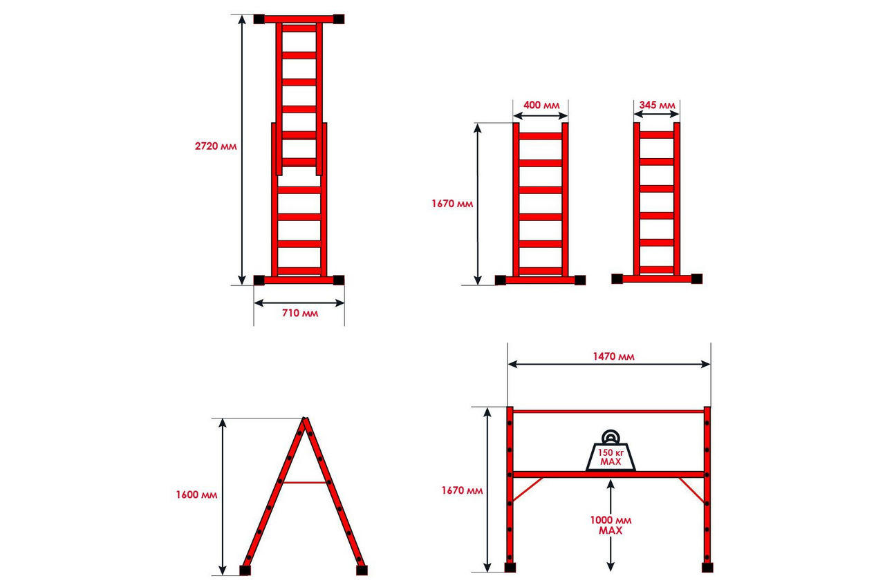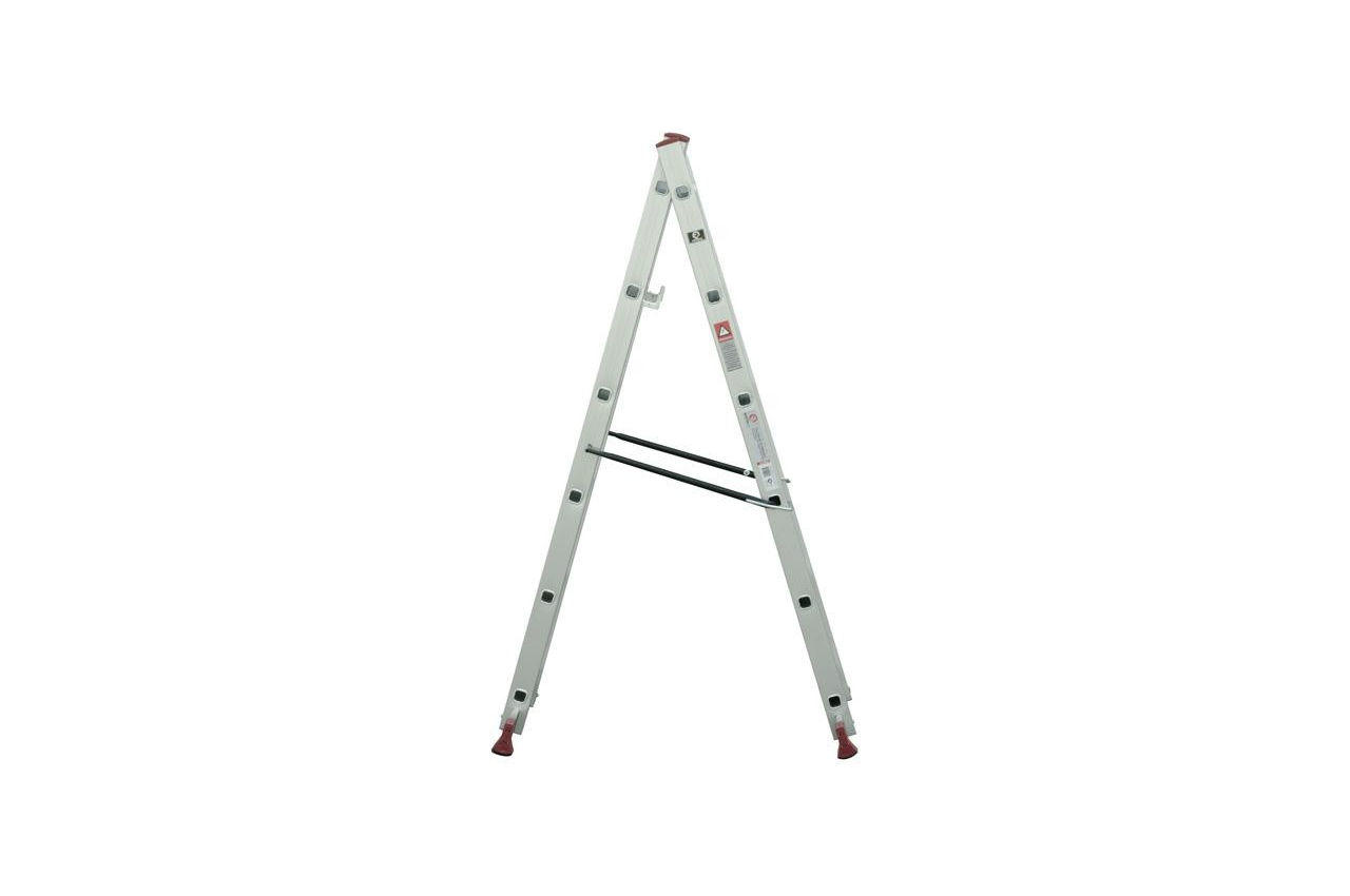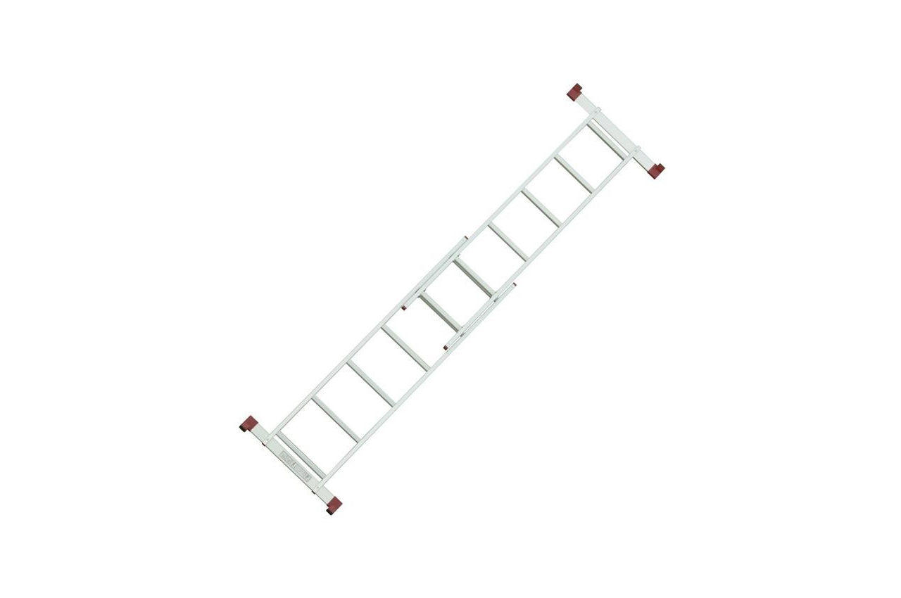 Сходи-поміст має надійну, при цьому легку конструкцію з алюмінію. Працювати на ній безпечно і зручно, оскільки має широкий майданчик (147 х 41 см), покриту антиковзаючим покриттям, яка фіксується на двох стійких приставних сходах, по 6 ступенів. На такому майданчику можна вільно пересуватися, а також використовувати як підставку для різних інструментів і підручних речей, які знадобляться Вам на висоті. Відрізняється своєю універсальністю. В ході невигадливих трансформацій, Ви отримуєте: Дві односекційні приставні сходи (L = 1,67 м). Одну двосекційну приставні сходи (L = 2,72 м). Двосторонню драбину (L = 1,6 м). Невеликі будівельні ліси з різною висотою помосту. Максимальне навантаження: 150 кг