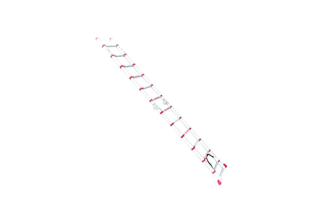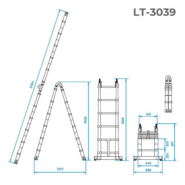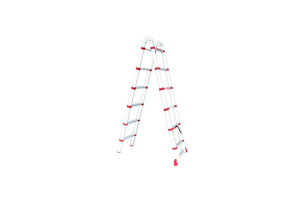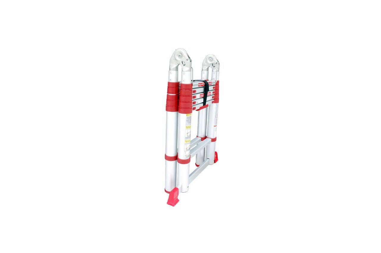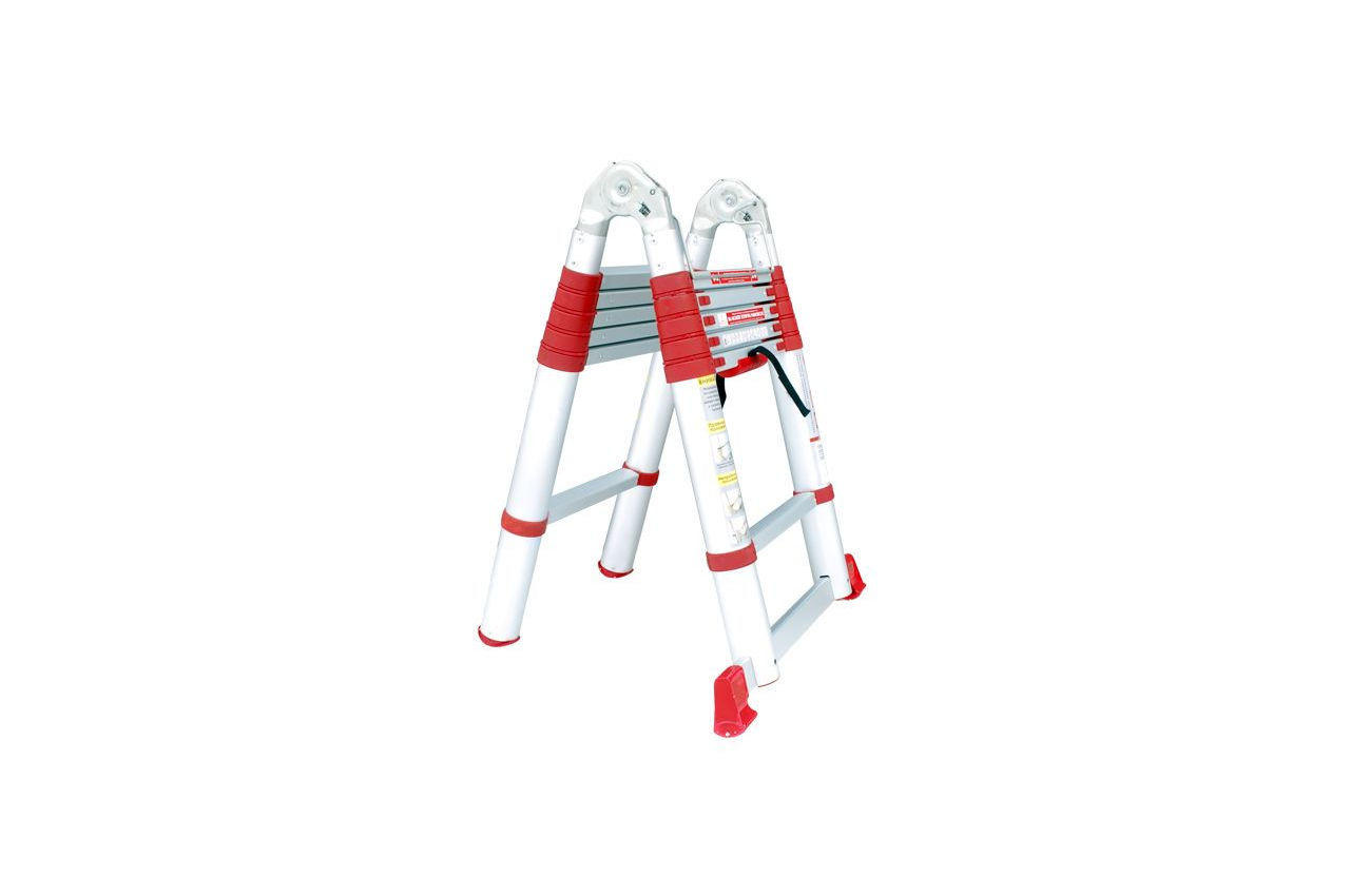 Драбина алюмінієва телескопічна розкладна. Складається з двох секцій по 6 рифлених щаблів шириною 300 мм. Секції з'єднані надійним шарнірним механізмом з замком безпеки дозволяє використовувати її в якості драбини і приставних сходів. Висота в розкладеному вигляді - 3850 мм, висота драбини - 1900 мм, вага сходи - 15 кг, витримує навантаження до 150 кг. Висота в розкладеному вигляді: 3850 мм; Кількість ступенів: 12 од .; Ширина ступені: 300 мм; Максимальне навантаження: 150 кг