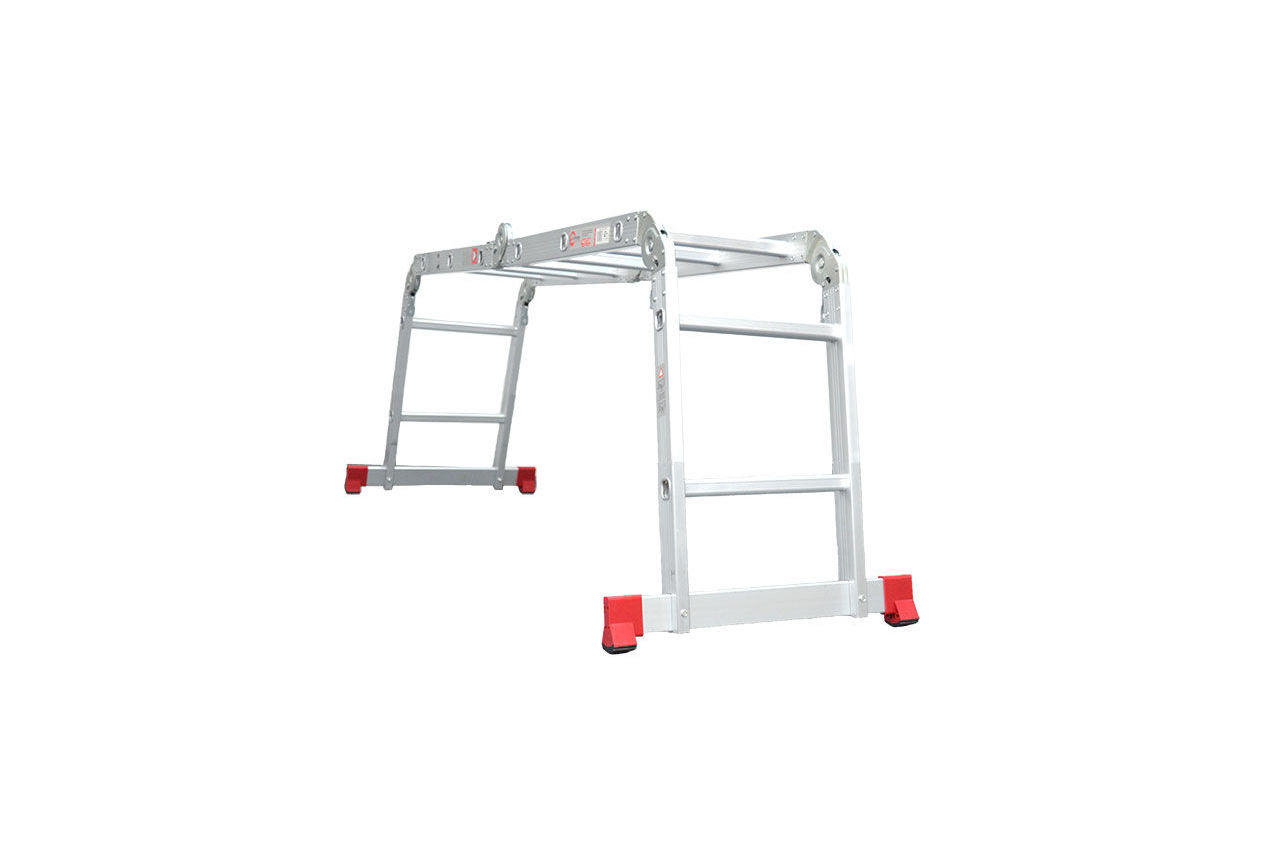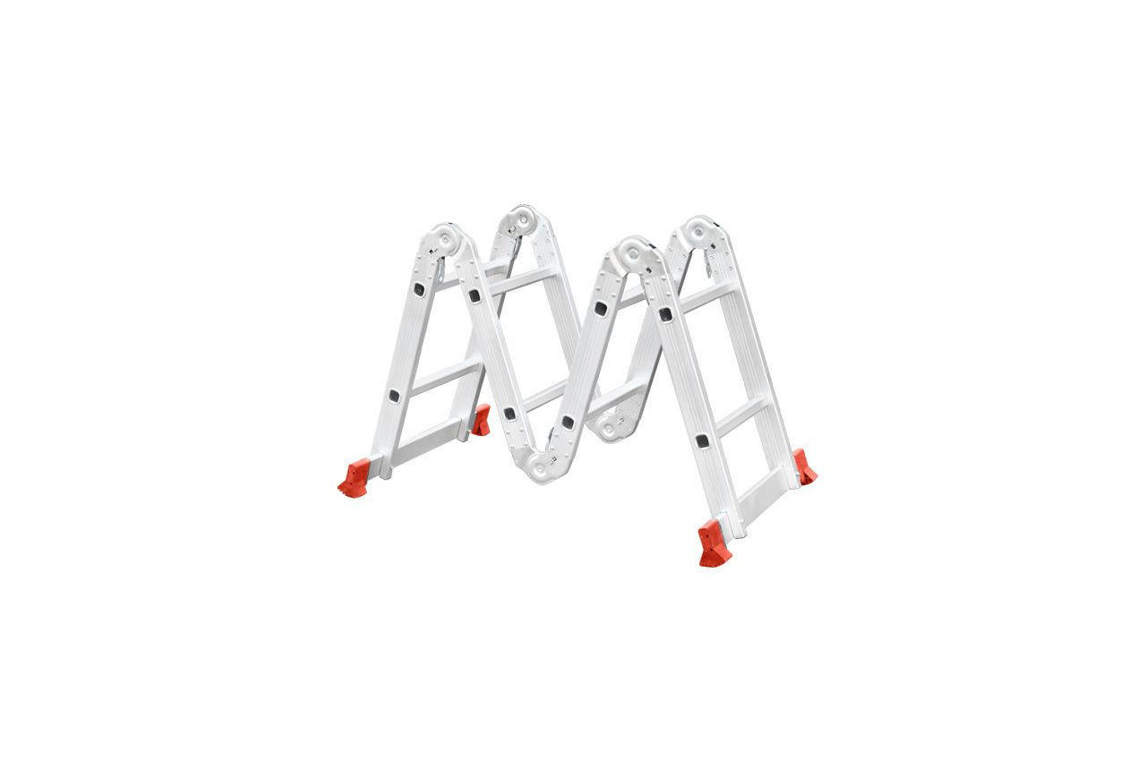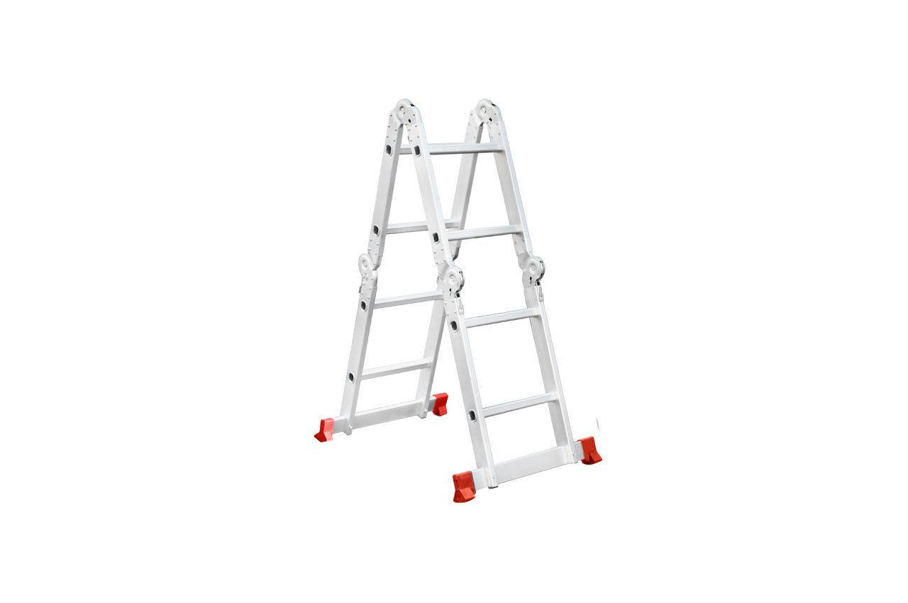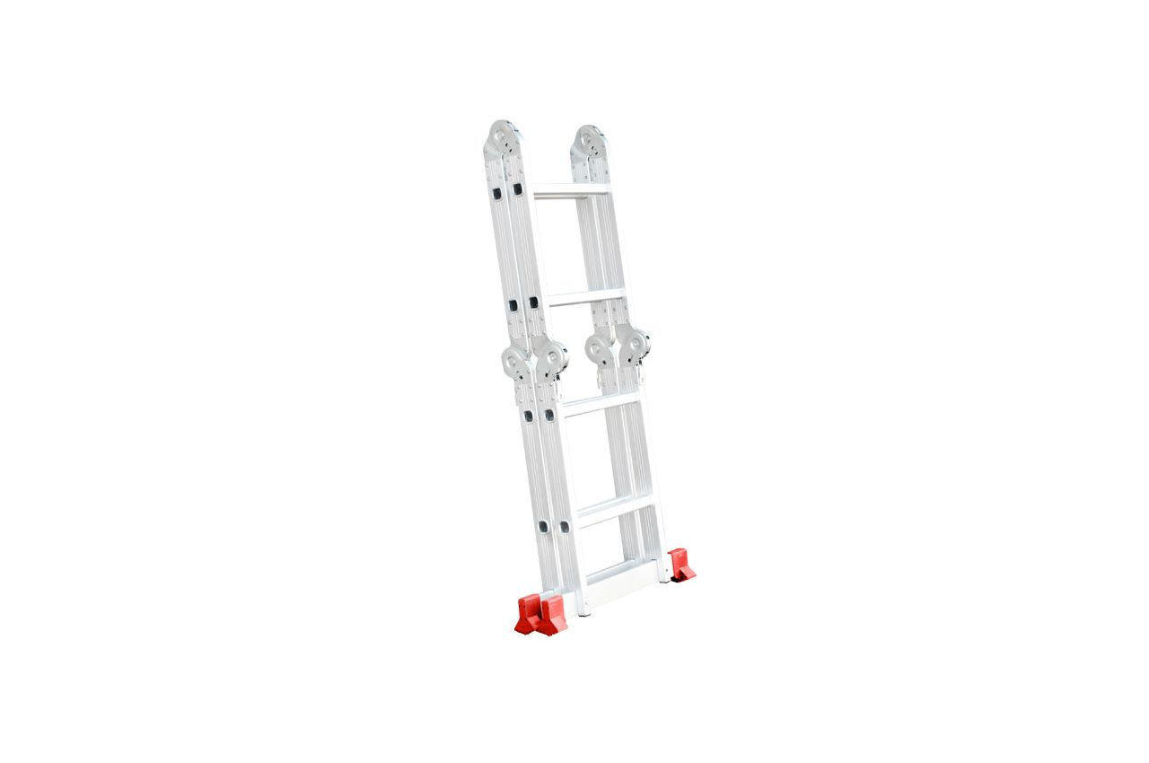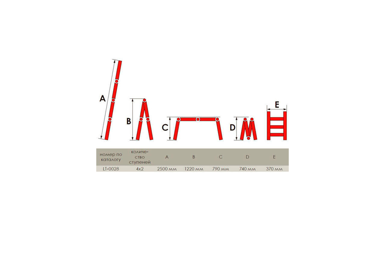 Сходи виготовлена з високоміцного екструдованого алюмінієвого профілю. Це забезпечує високу жорсткість конструкції, а також здатність витримати навантаження до 150 кг. Щоб уникнути ковзання, сходи укомплектовані надійними еластичними пластиковими підошвами. Сходи мають міцні рифлені щаблі, які не дадуть нозі зісковзнути. Висота в складеному вигляді: 740 мм; Ширина сходів: 345 мм; Кількість ступенів: 4x2 од .; Максимальне навантаження: 150 кг