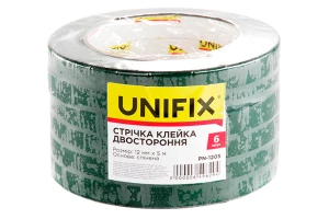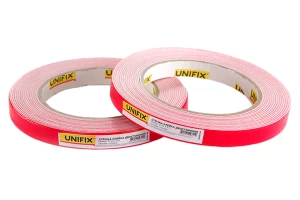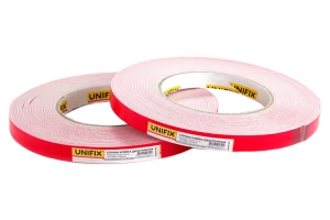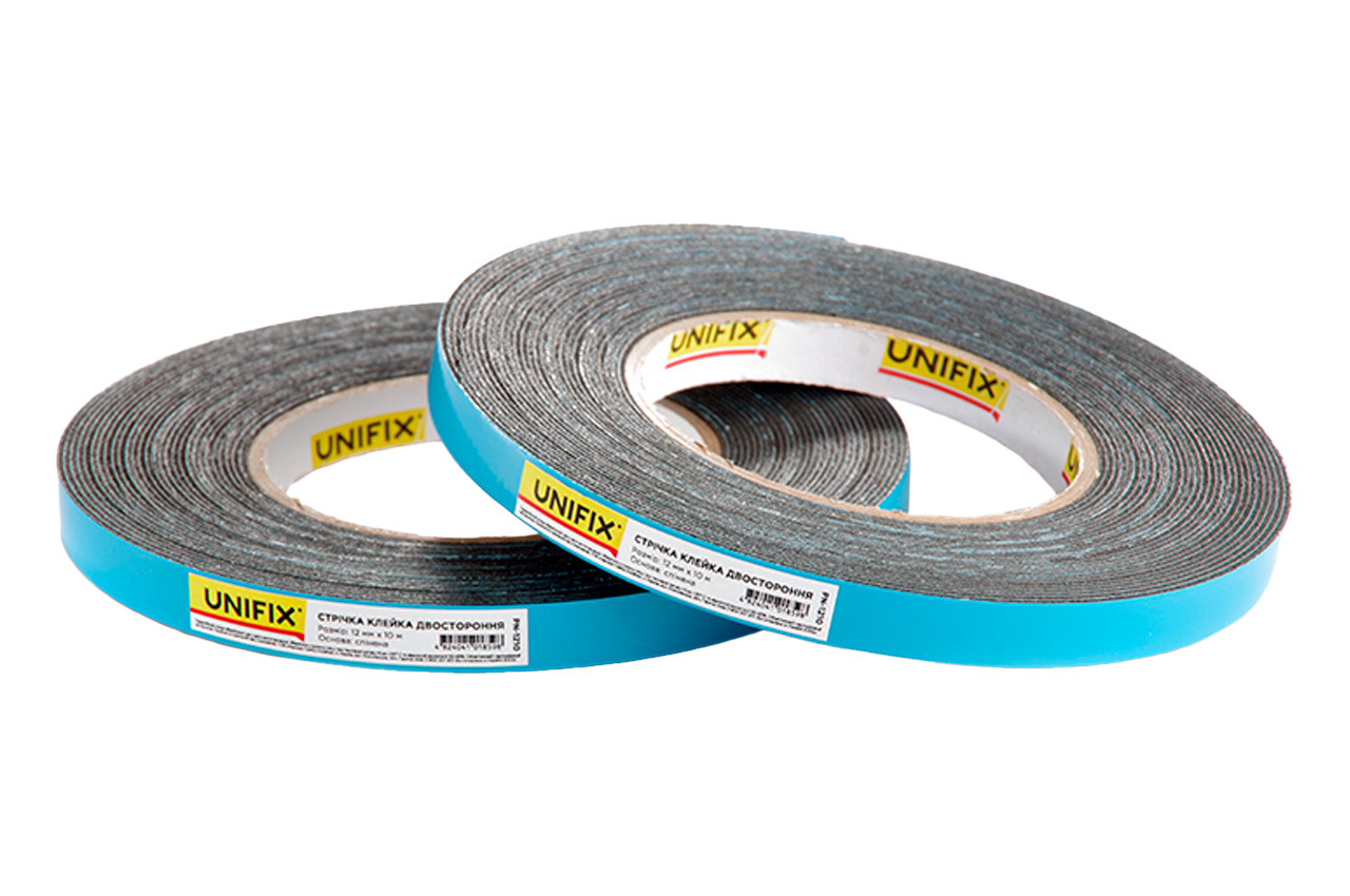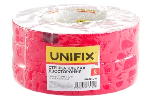 Спінена клейка стрічка (скотч) Unifix шириною 12мм - дозволяє моментально приклеювати практично будь-які об'єкти на будь-які поверхні в приміщенні. Широко використовується в будівництві та ремонті. Стрічка чудово компенсує дрібні щілини, нерівності та похибки між поверхнями, що слеюються - незамінна для з'єднання поверхонь з нещільним приляганням: шорсткі поверхні, довгі деталі з похибкою прилягання (плінтуса, профілі, панелі, накладки тощо).