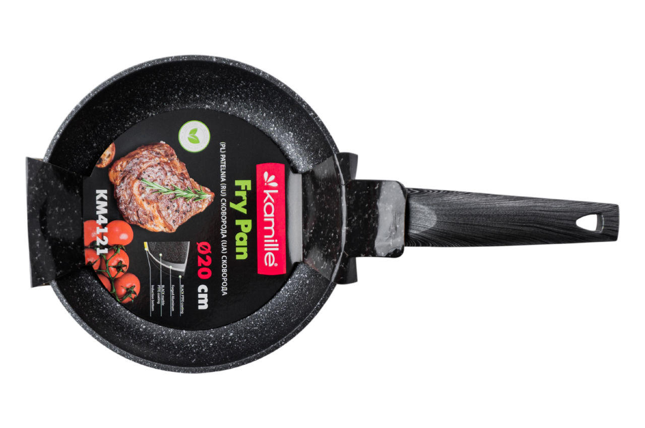 Сковорода антипригарна Kamille - 200 мм Black Marble. Завдяки міцному антипригарному покриттю, така сковорода стійка до механічних впливів, за рахунок чого значно збільшується термін її служби. Сковорода нагрівається рівномірно, не створюючи перегрітих ділянок і холодних країв, навіть у тих випадках, коли процес приготування їжі йде на невеликому вогні. У результаті скорочується час приготування страви і зменшується ризик є суміш недосмажене або пережареної їжі.