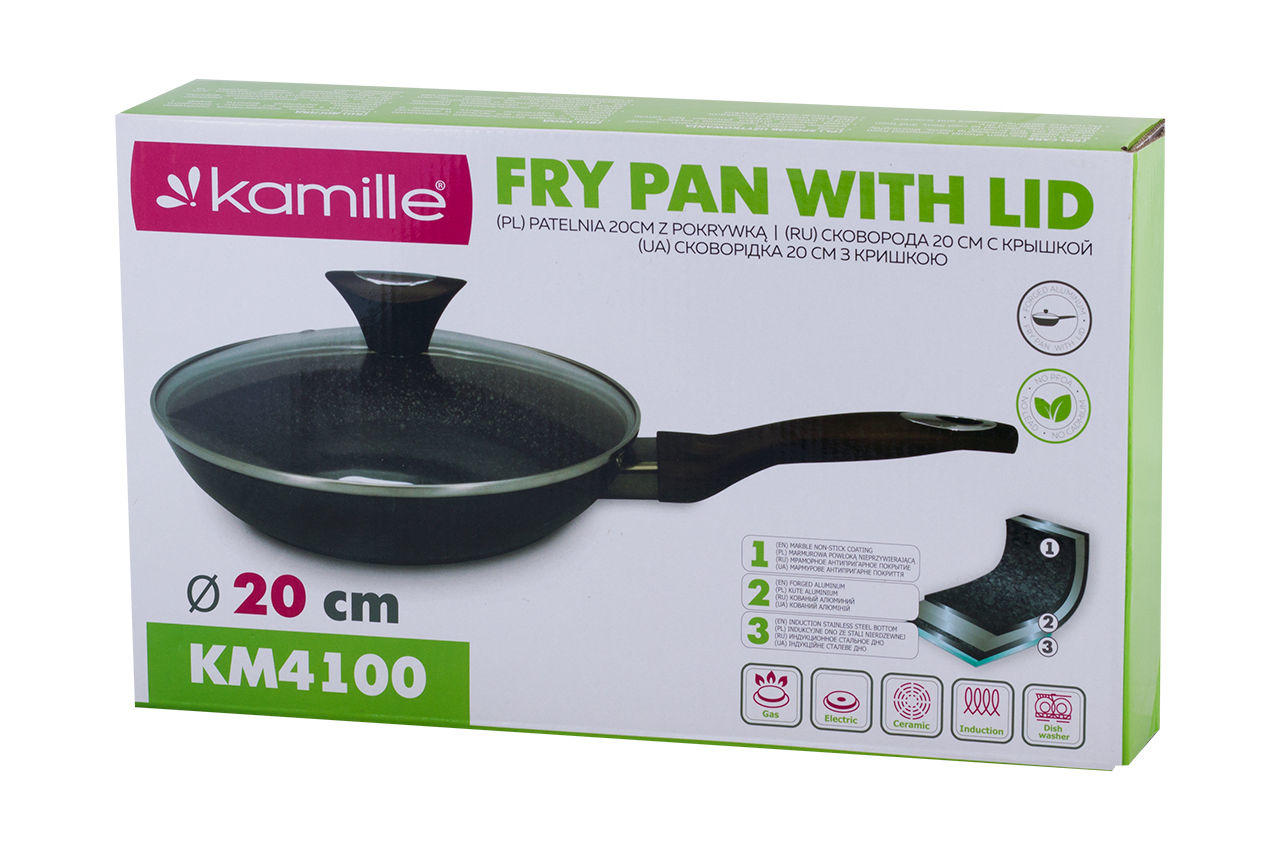 Сковорода антипригарна Kamille - 200 мм Black Marble з кришкою. Завдяки міцному антипригарному покриттю, така сковорода стійка до механічних впливів, за рахунок чого значно збільшується термін її служби. Сковорода нагрівається рівномірно, не створюючи перегрітих ділянок і холодних країв, навіть у тих випадках, коли процес приготування їжі йде на невеликому вогні. У результаті скорочується час приготування страви і зменшується ризик є суміш недосмажене або пережареної їжі.
