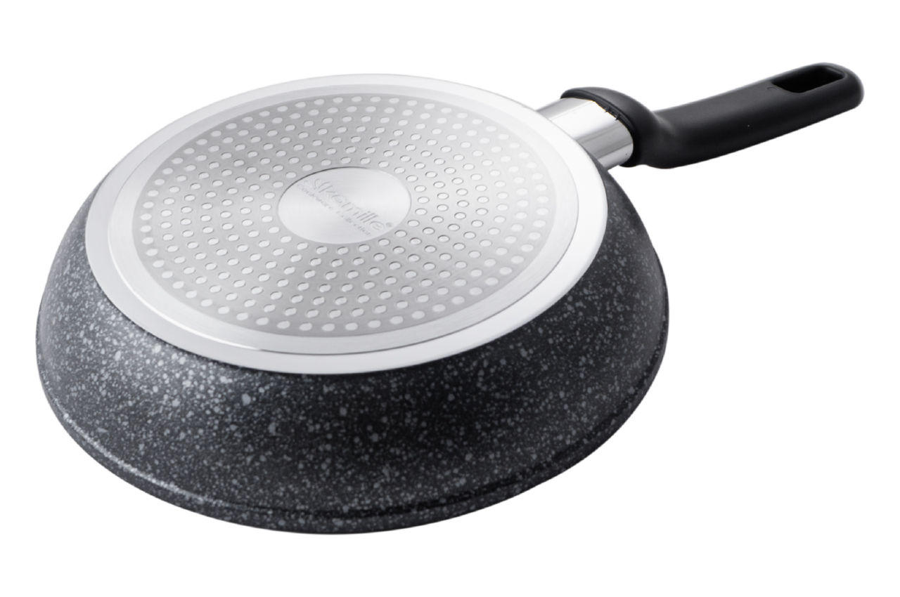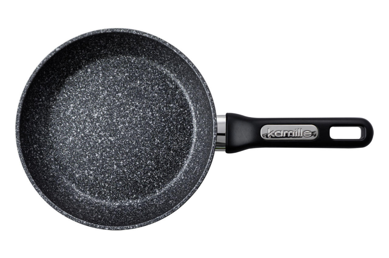 Сковорода антипригарна Kamille - 220 мм Ilag Black Marble. Завдяки міцному антипригарному покриттю, така сковорода стійка до механічних впливів, за рахунок чого значно збільшується термін її служби. Сковорода нагрівається рівномірно, не створюючи перегрітих ділянок і холодних країв, навіть у тих випадках, коли процес приготування їжі йде на невеликому вогні. У результаті скорочується час приготування страви і зменшується ризик є суміш недосмажене або пережареної їжі. Діаметр: 22 см. Висота: 4,5 див. Довжина ручки: 16см. Матеріал: кований алюміній. Матеріал ручки: бакеліт з покриттям soft-touch". Антипригарне покриття: ILAG чорний мармур PTFE покриття.