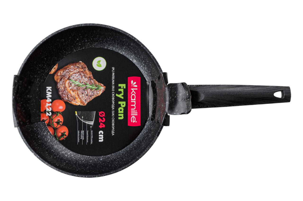 Антипригарна сковорода Kamille - 240 мм Black Marble Завдяки міцному мармуровому покриттю, така сковорода стійка до механічних впливів, за рахунок чого значно збільшується термін її служби. Сковорода нагрівається рівномірно, не створюючи перегрітих ділянок та холодних країв, навіть у тих випадках, коли процес приготування їжі йде на невеликому вогні. В результаті скорочується час приготування страви та зменшується ризик їсти суміш недосмаженої або пересмаженої їжі.