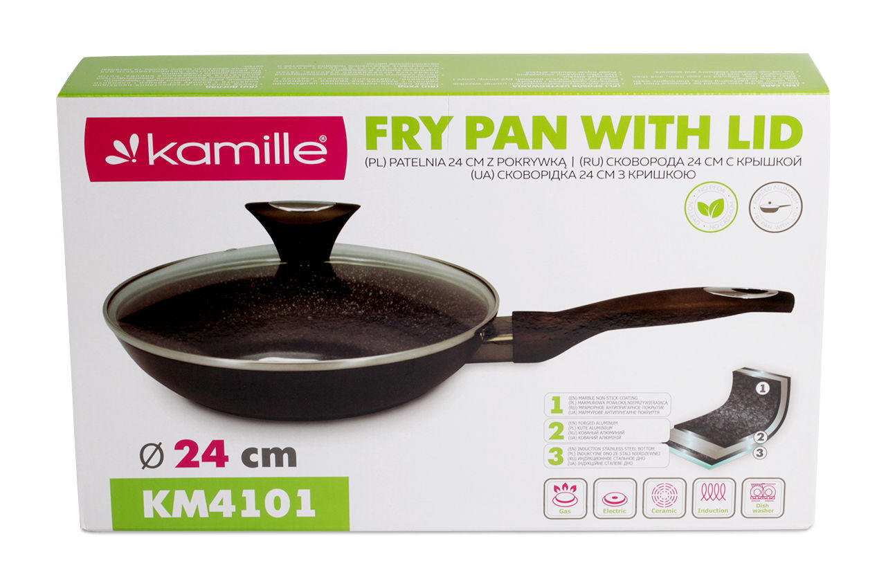 Сковорода антипригарна Kamille - 240 мм Black Marble з кришкою. Завдяки міцному антипригарному покриттю, така сковорода стійка до механічних впливів, за рахунок чого значно збільшується термін її служби. Сковорода нагрівається рівномірно, не створюючи перегрітих ділянок і холодних країв, навіть у тих випадках, коли процес приготування їжі йде на невеликому вогні. У результаті скорочується час приготування страви і зменшується ризик є суміш недосмажене або пережареної їжі.