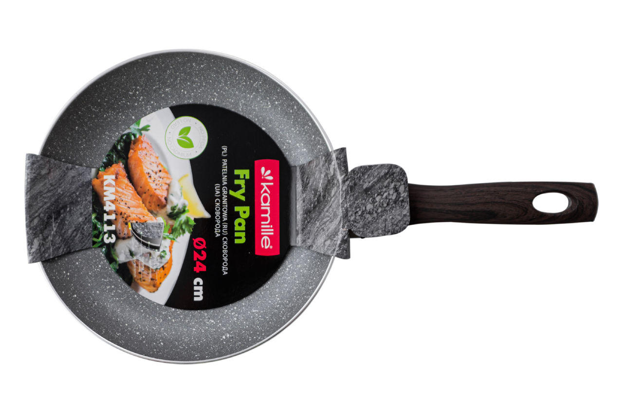 Сковорода антипригарна Kamille - 240 мм Grey Marble 4113 Діаметр 24см, висота стінок 4.5см, довжина ручки 17.5см. Виготовлена із кованого алюмінію. Універсальна сковорода з високим рівнем міцності, високими теплопровідними властивостями, стійкістю до деформації при нагріванні до високих температур. Висококласне антипригарне покриття ILAG забезпечує рівномірний розподіл тепла і захищає їжу від пригоряння. Сковорода з антипригарним покриттям абсолютно безпечна для здоров'я і навколишнього середовища. Легко миється вручну і в посудомийній машині. Бакелітова ручка з покриттям "Soft-Touch", стилізована під дерево, коричневого кольору. Сковорода підходить для індукційних плит.