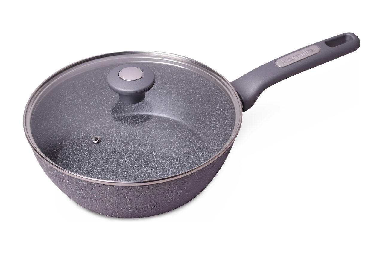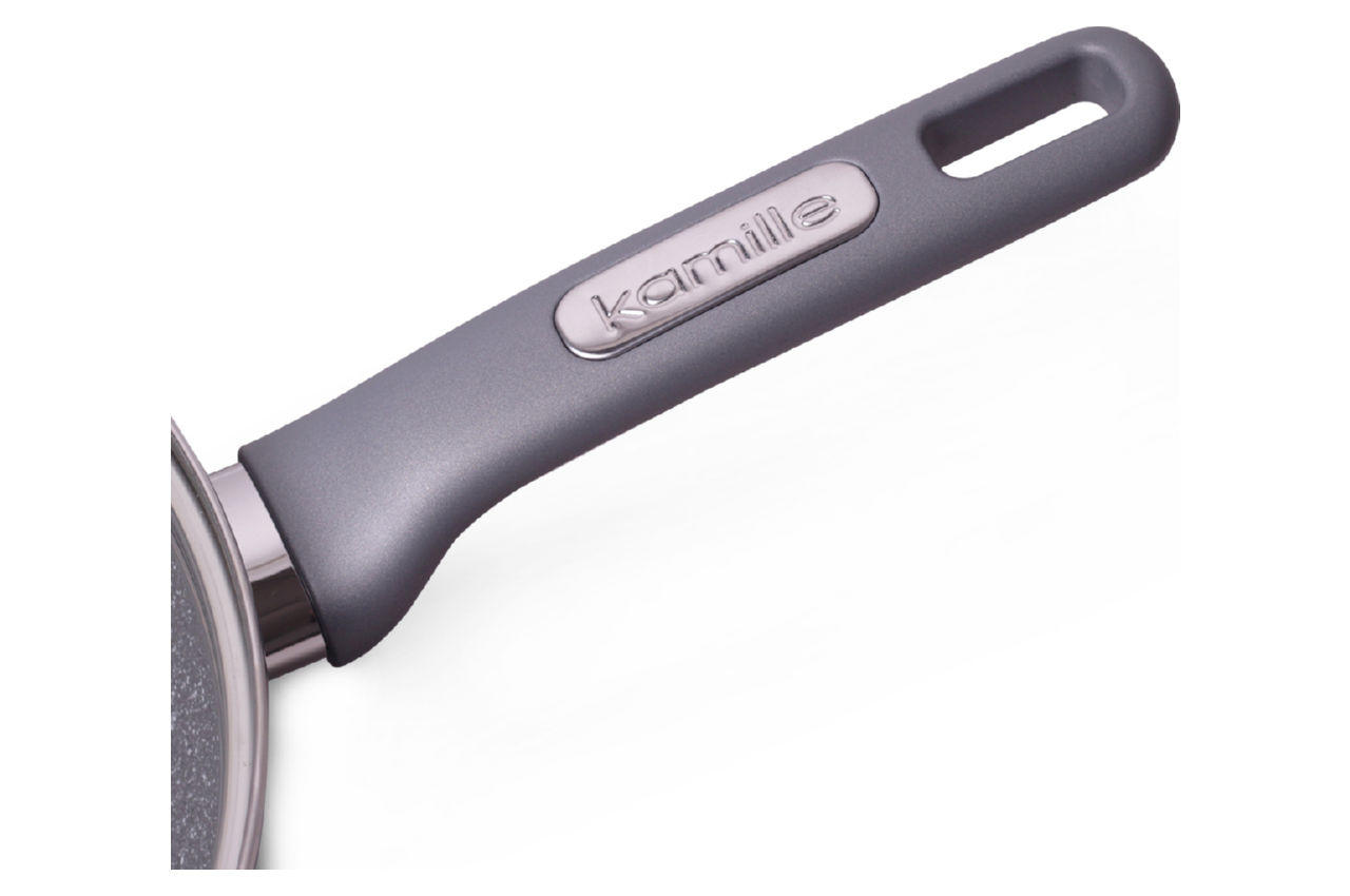Сковорода антипригарна Kamille - 260 мм Granite глибока з кришкою. Завдяки міцному гранітного покриття, такий сотейник стійкий до механічних впливів, за рахунок чого значно збільшується термін його служби. Сотейник нагрівається рівномірно, не створюючи перегрітих ділянок і холодних країв, навіть у тих випадках, коли процес приготування їжі йде на невеликому вогні. Матеріал сотейника: литий алюміній Матеріал ручки: бакеліт Матеріал кришки: жаростійке скло Внутрішнє покриття: граніт Діаметр: 26см Висота: 7.5 см