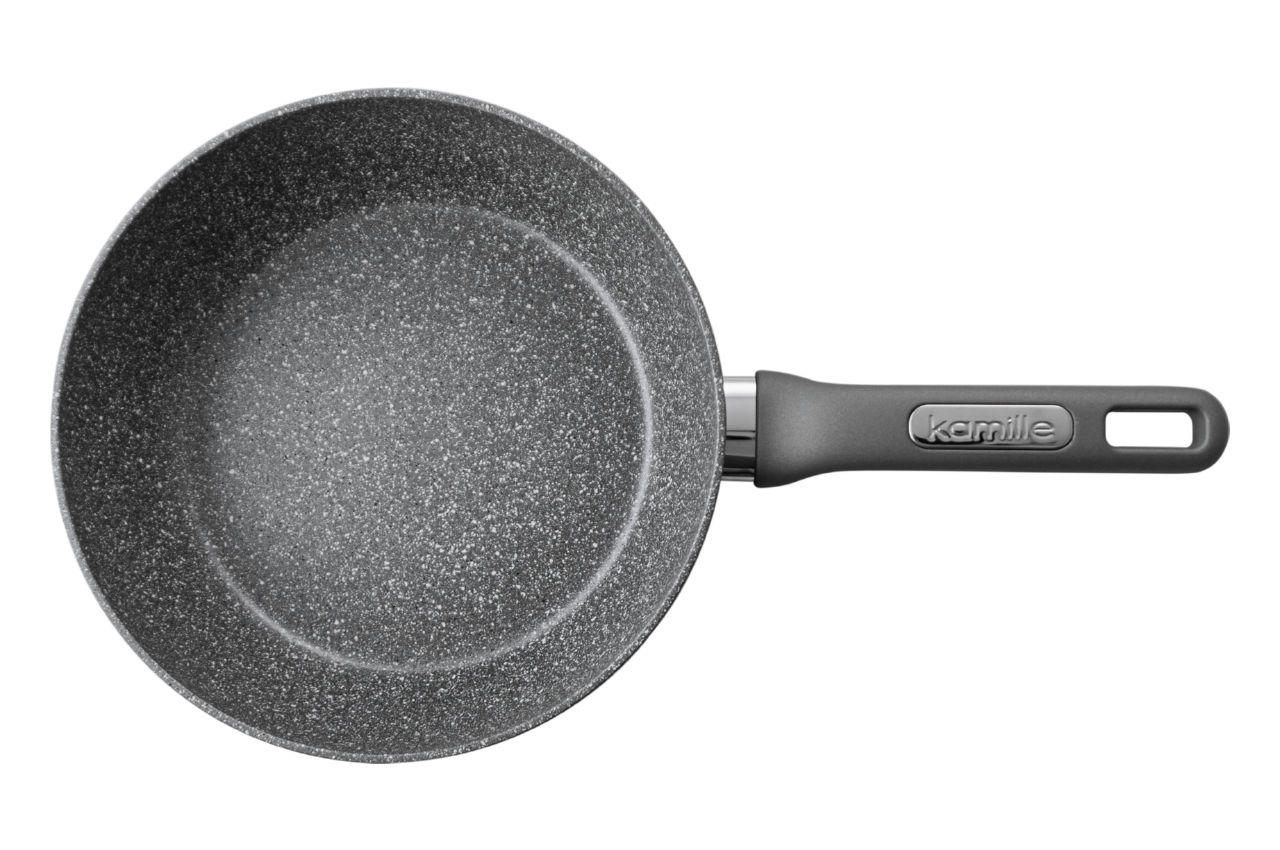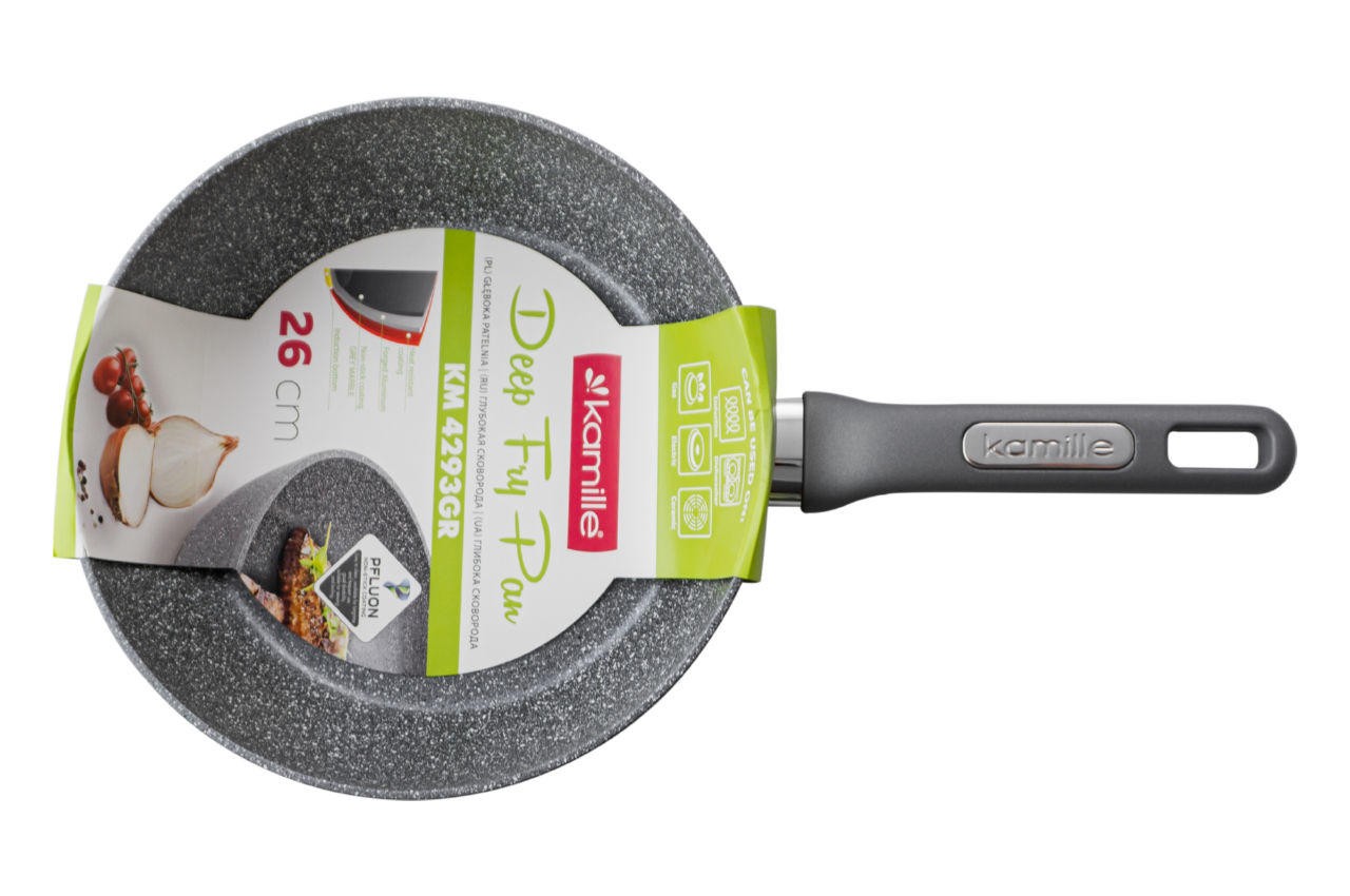 Сковорода антипригарна Kamille - 260 мм Grey Marble глибока. Завдяки міцному гранітного покриття, така сковорода стійка до механічних впливів, за рахунок чого значно збільшується термін її служби. Сотейник нагрівається рівномірно, не створюючи перегрітих ділянок і холодних країв, навіть у тих випадках, коли процес приготування їжі йде на невеликому вогні. У результаті скорочується час приготування страви і зменшується ризик є суміш недосмажене або пережареної їжі.