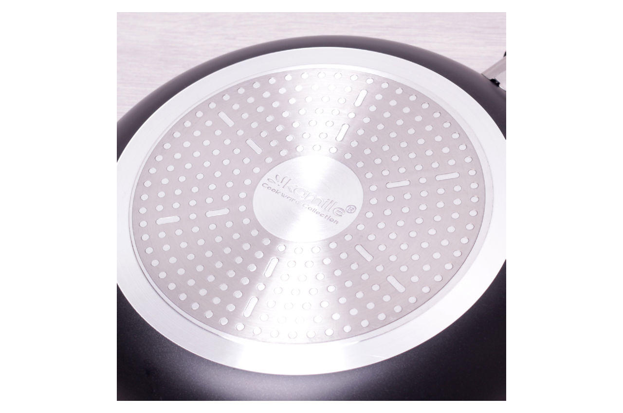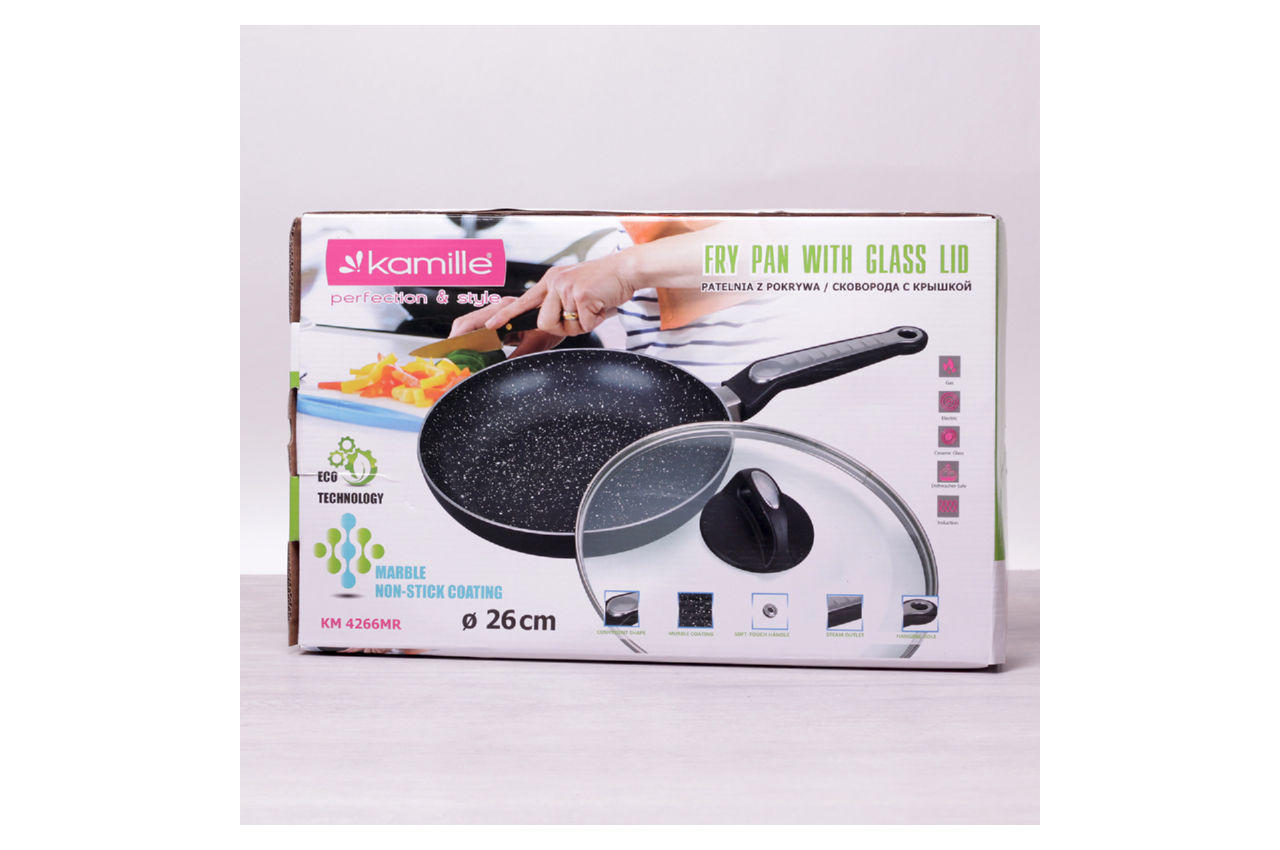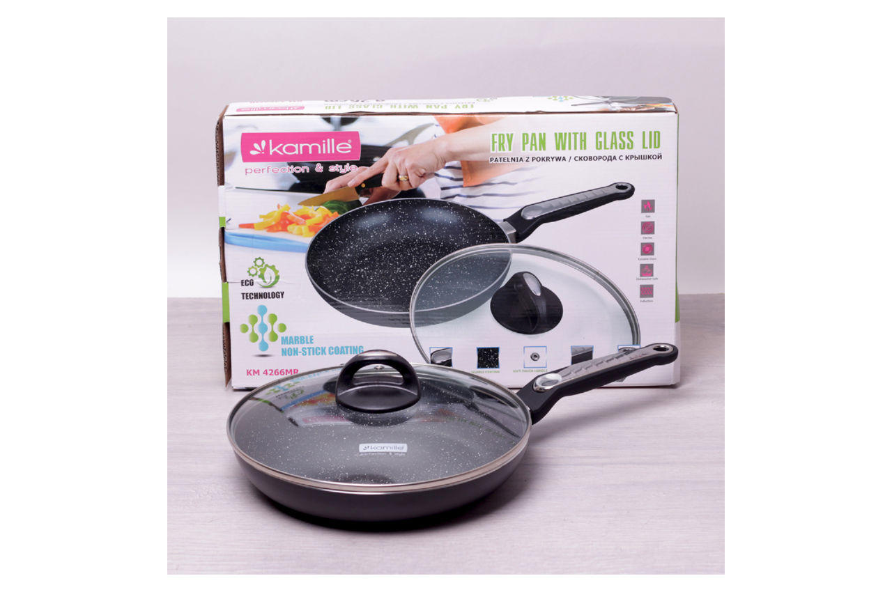 Сковорода антипригарна Kamille - 260 мм мармур з кришкою зручна та практична у використанні. Така сковорода є стійкою до механічних впливів, за рахунок чого значно збільшується її термін служби. Сковорода з мармуровим покриттям нагрівається рівномірно, не створюючи перегрітих ділянок та холодних країв, навіть у тих випадках, коли процес приготування їжі йде на невеликій конфорці. Завдяки цьому скорочується час приготування страви та зменшується ризик їсти суміш недосмаженої або пересмаженої їжі.