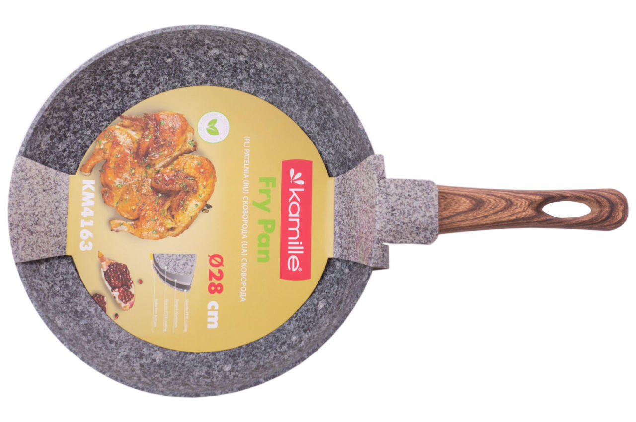 Сковорода антипригарна Kamille - 280 мм Granite. Кухня без хорошої сковороди , бажано не однієї, — просто немислима. Діаметр: 28см. Висота 5,5 див. Довжина ручки: 19,5 див. Матеріал: алюміній. Матеріал ручки: бакеліт з малюнком "під дерево". Антипригарне покриття: гранітне PTFE.