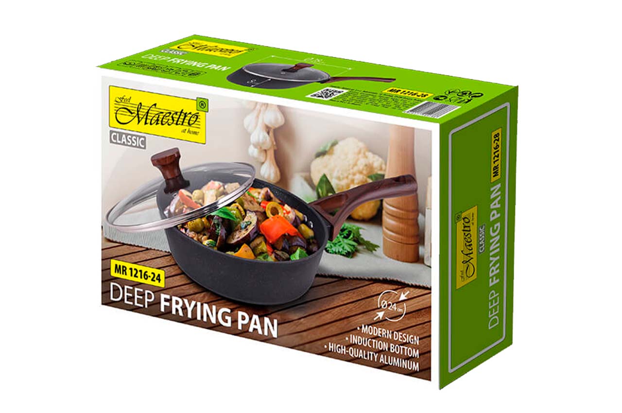 Шикарна сковорода-сотейник Maestro MR 1216-24 з антипригарним покриттям Granite. Корпус виготовлений із високоякісного алюмінію. Сковорода має зручну бакелітову ручку soft-touch, яка не нагрівається при використанні, легко миється. Кришка у комплекті. Сотейник виглядає дуже дорого завдяки дизайну ручок під темне дерево.