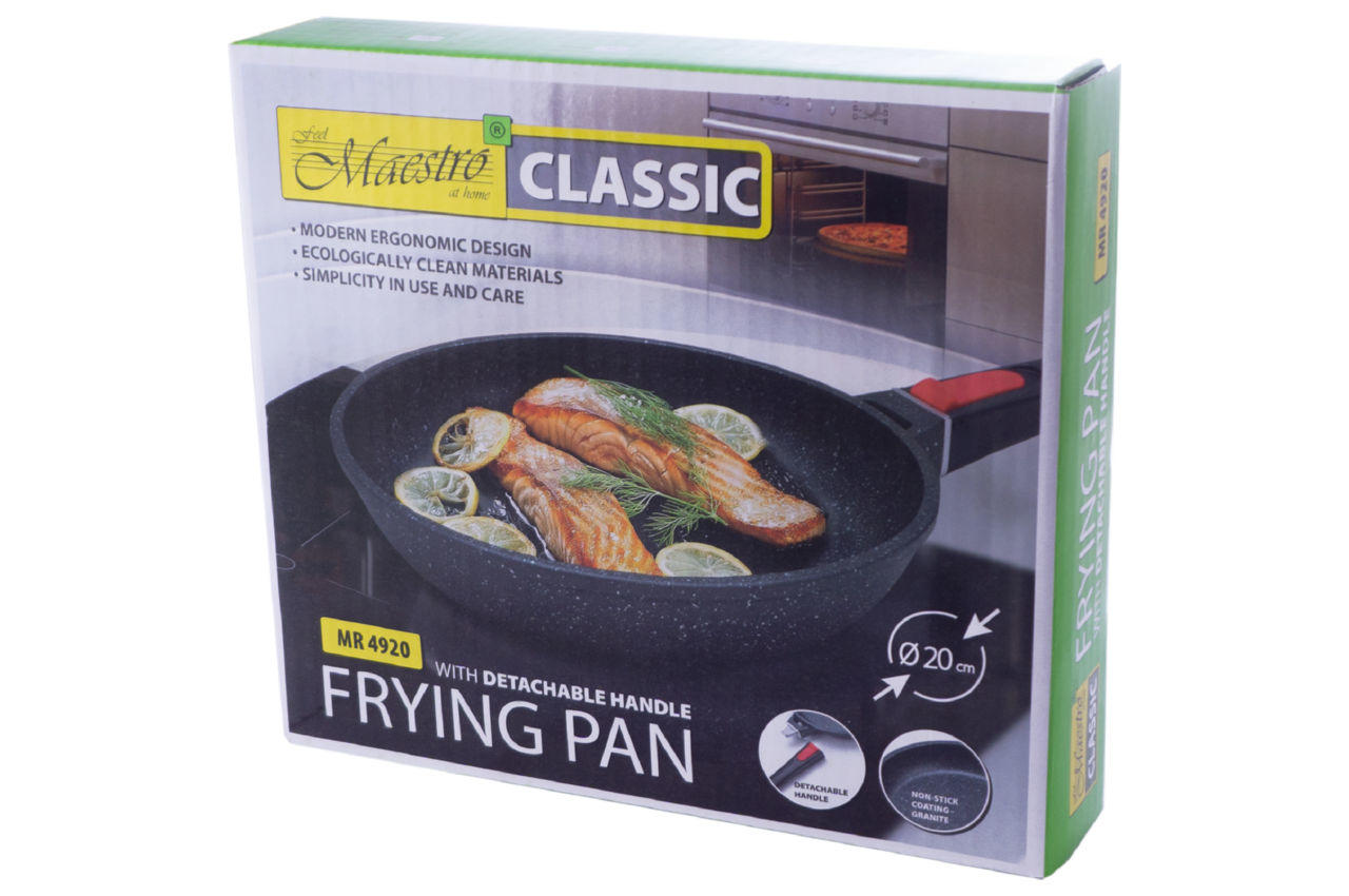 Сковорода Maestro MR4920 діаметром 20 см зі знімною ручкою проста у використанні та догляді, легко миється. Усередині покрита стійким до механічного впливу гранітним антипригарним покриттям.