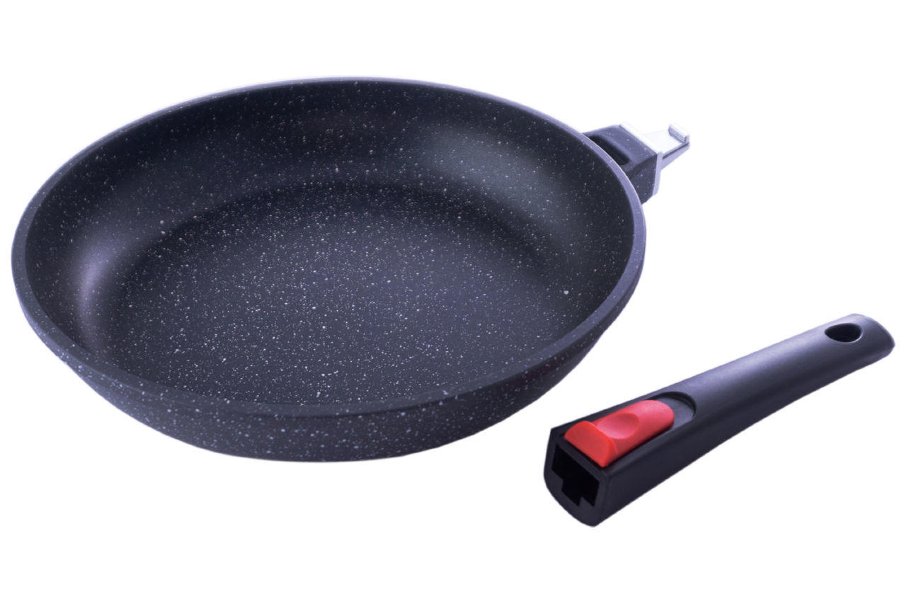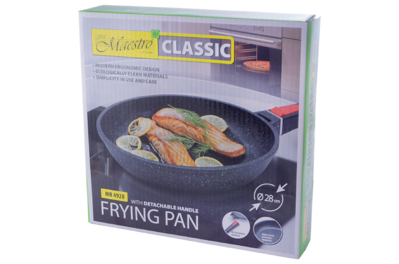 Сковорода Maestro MR4928 діаметром 28 см зі знімною ручкою проста у використанні та догляді, легко миється. Усередині покрита стійким до механічного впливу гранітним антипригарним покриттям. Завдяки надійному пристрою з можливістю відстебнути-пристебнути ручку в будь-який момент, сковороду Маестро МР 4928 зручно використовувати не тільки для смаження на плиті, але також для запікання в духовці.