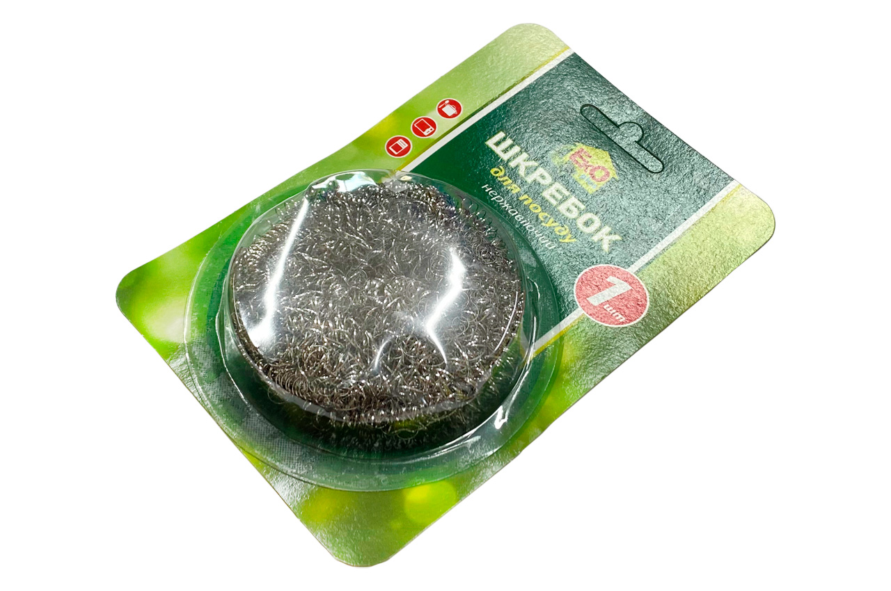 Нержавіючий скребок для посуду розміром 80 х 80 х 20 мм, призначений для ефективного очищення каструль, сковорідок та гриль-панелей від пригорілого жиру та нагару.
