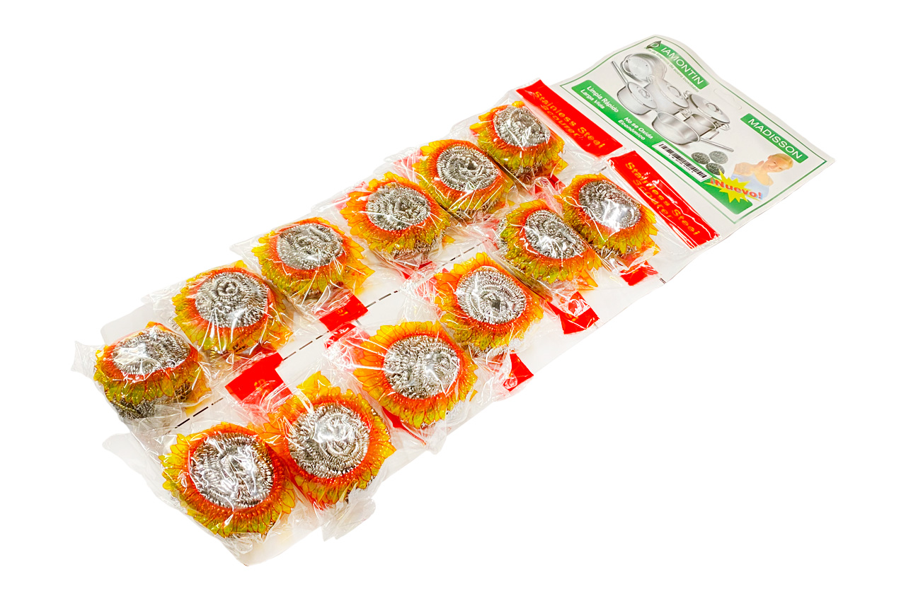 Нержавіючий скребок для посуду розміром 80х80х20 мм, призначений для ефективного очищення каструль, сковорідок та гриль-панелей від жиру, що пригорів, і нагару. У наборі 12 шт.