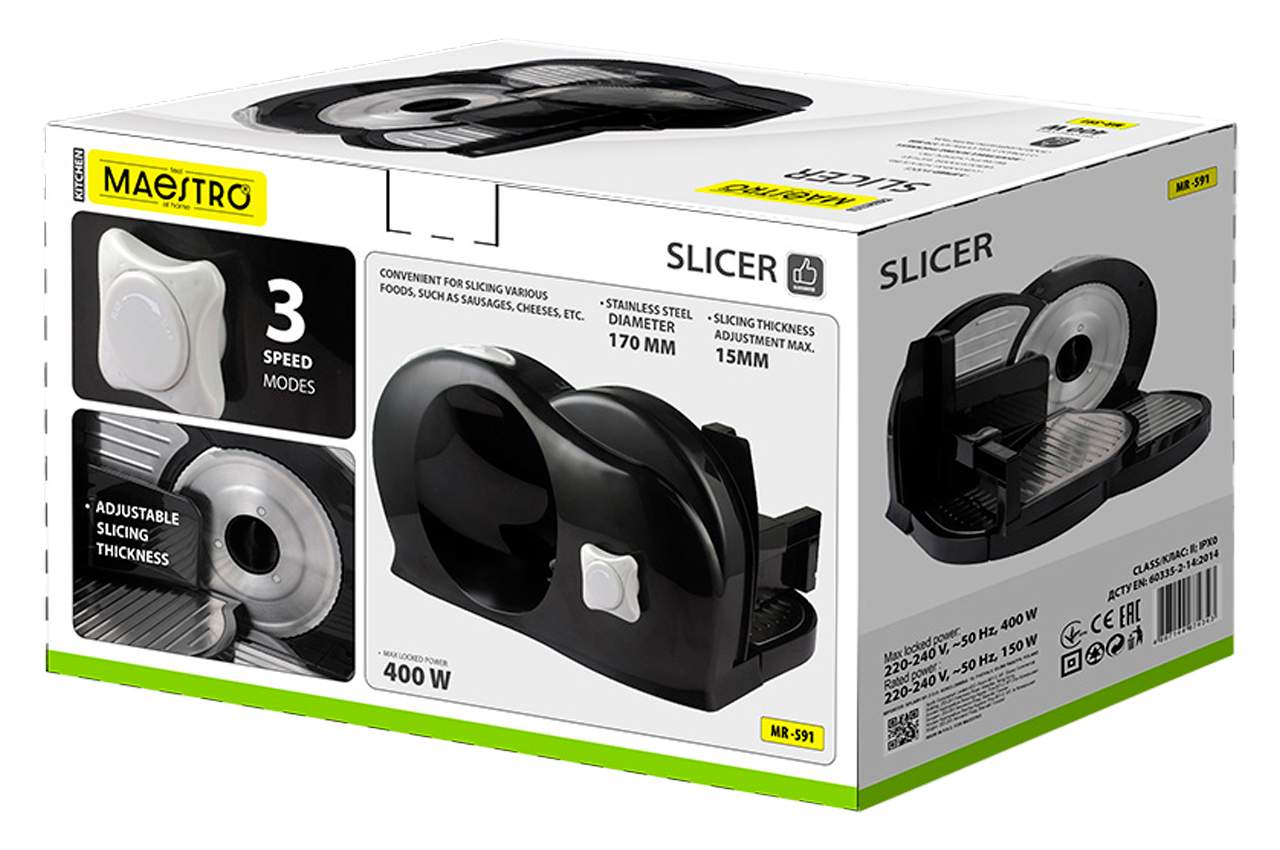 MR-591 – це модель кухонного слайсера від бренду Maestro, яка призначена для нарізання різноманітних продуктів (хліба, ковбас, сиру, овочів) і має сучасний дизайн, потужність близько 150-400 Вт, та 3 швидкісні режими для гнучкості використання вдома