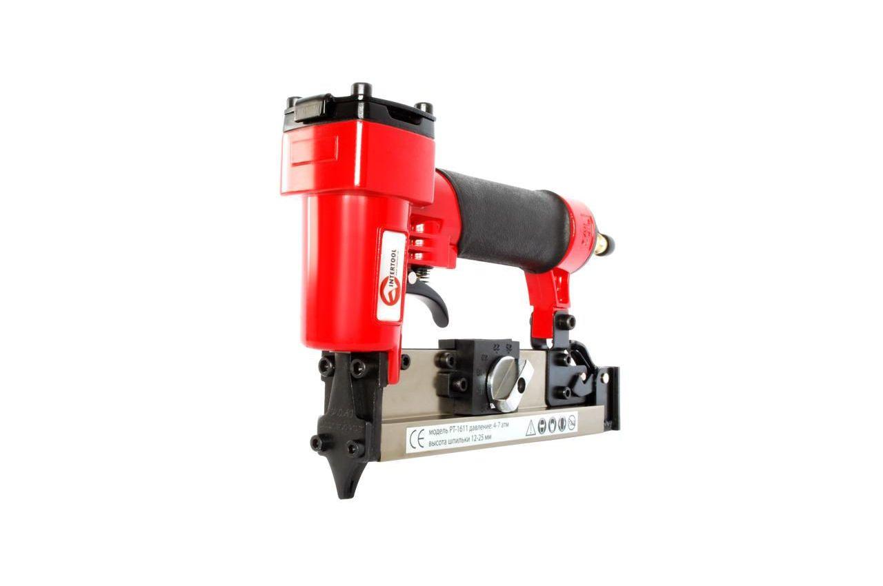 Пневматический степлер РТ-1611 рассчитан на работу со шпилькой высотой от 12 до 25 мм. Применяется в основном в мебельной промышленности, а также для некоторых видов строительных и отделочных работ. Давление сжатого воздуха от компрессора величиной 7 атмосфер передает необходимую силу для пробивания даже твердых пород древесины и ДСП. Степлер РТ-1611 оснащен обрезиненной рукояткой, которая не утомляет руку и способствует длительной и качественной работе с аппаратом. Одними из его главных преимуществ является механизм быстрой загрузки расходных материалов. Диаметр шланга: 6-8 мм; Расход воздуха: 0,25 на шпильку л; Совместимость: шпилька; Высота шпильки: 12-25 мм; Покрытие рукоятки: резина; Рабочее давление: до 7 атм