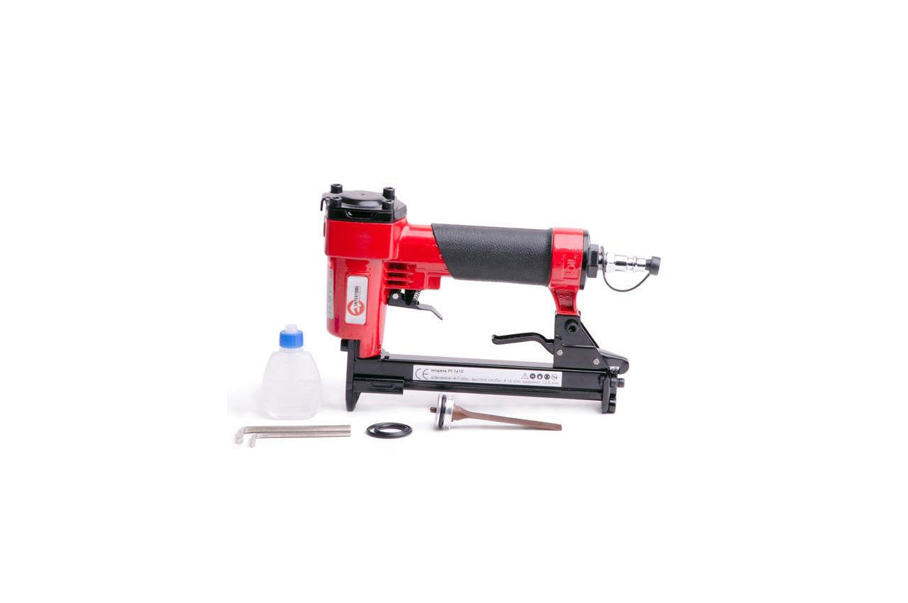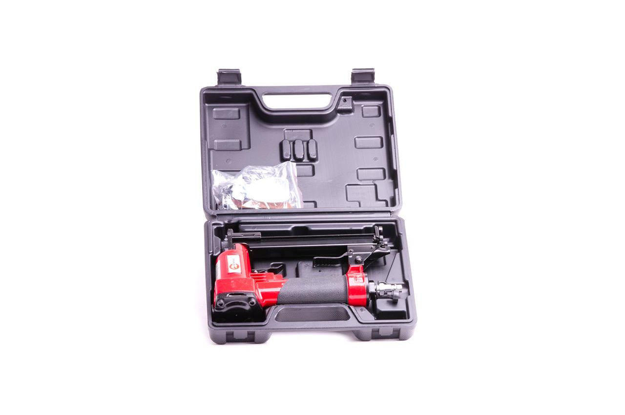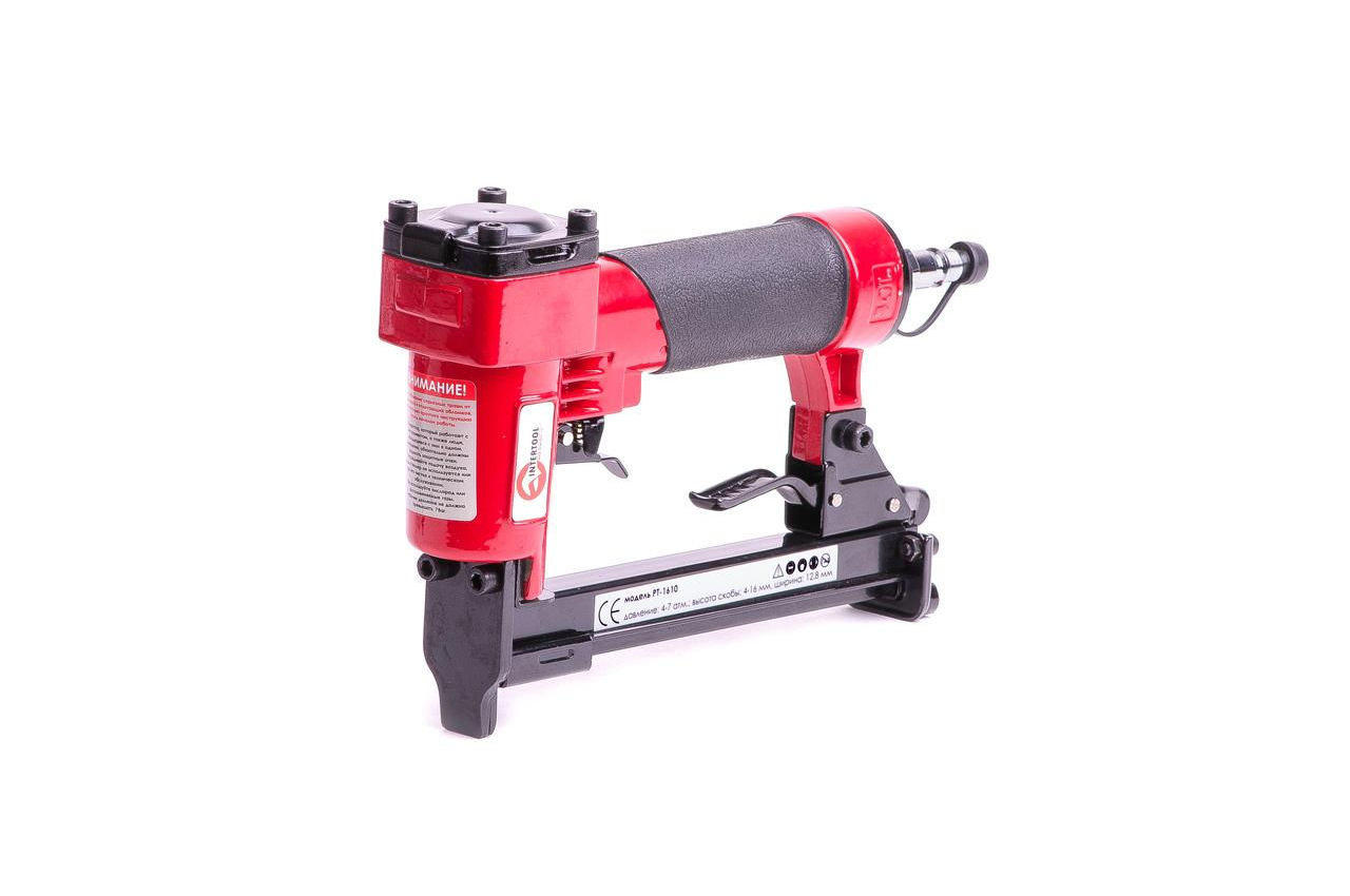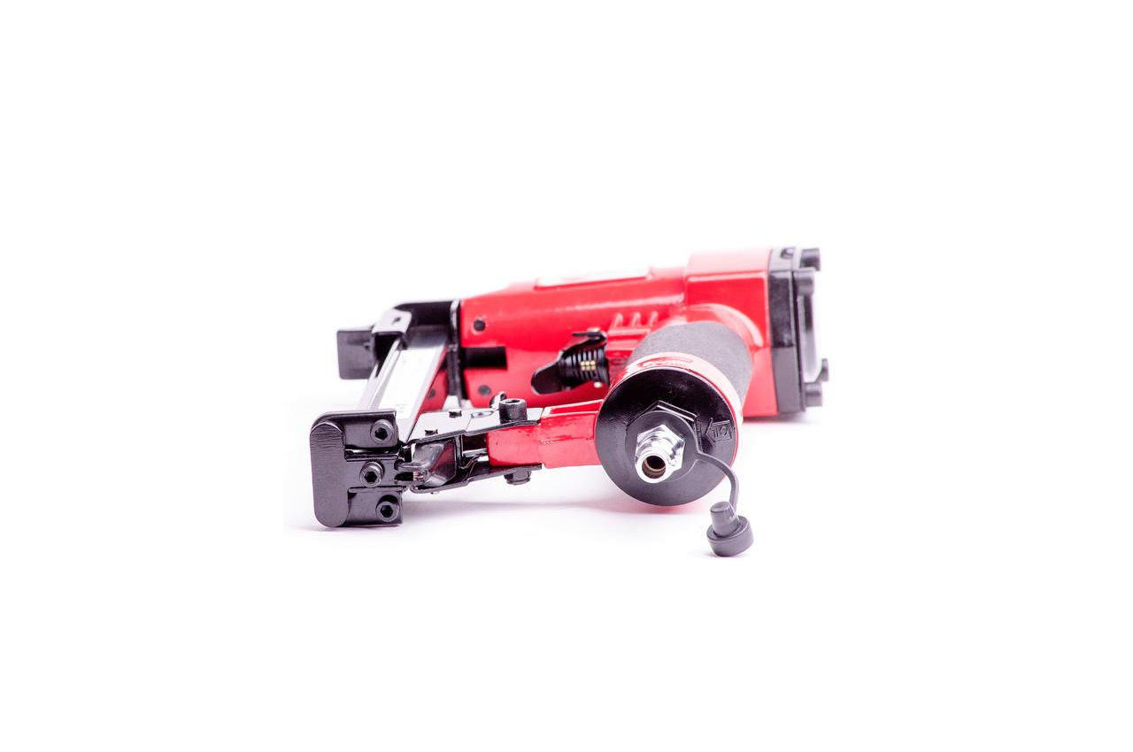 Пневматичний степлер під скобу широко застосовується в меблевій промисловості та будівельно-ремонтних роботах. Одним з головних його переваг - наявність механізму швидкого завантаження скоб, що істотно підвищує швидкість і ефективність роботи. Висота скоб, з якими може працювати степлер від 6 до 16 мм, ширина - 12,8 мм і перетин - 0,7 мм. Також передбачена можливість регулювання напряму викиду повітря. Для забезпечення додаткової безпеки передбачена блокування пускового гачка. Пневмостеплер має ергономічний дизайн і обрезиненную рукоятку, що істотно підвищує комфорт роботи з даним інструментом. Діаметр шланга: 6-8 мм; Витрата повітря: 0,25 на скобу л; Сумісність: скоба; Покриття рукоятки: гума; Ширина скоби: 12.8 мм; Висота скоби: 4-16 мм; Робочий тиск: до 7 атм