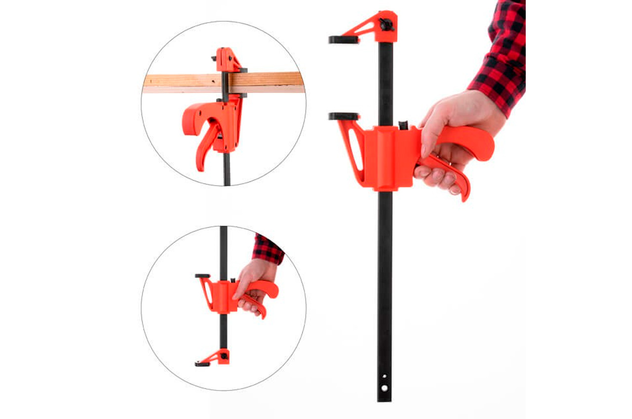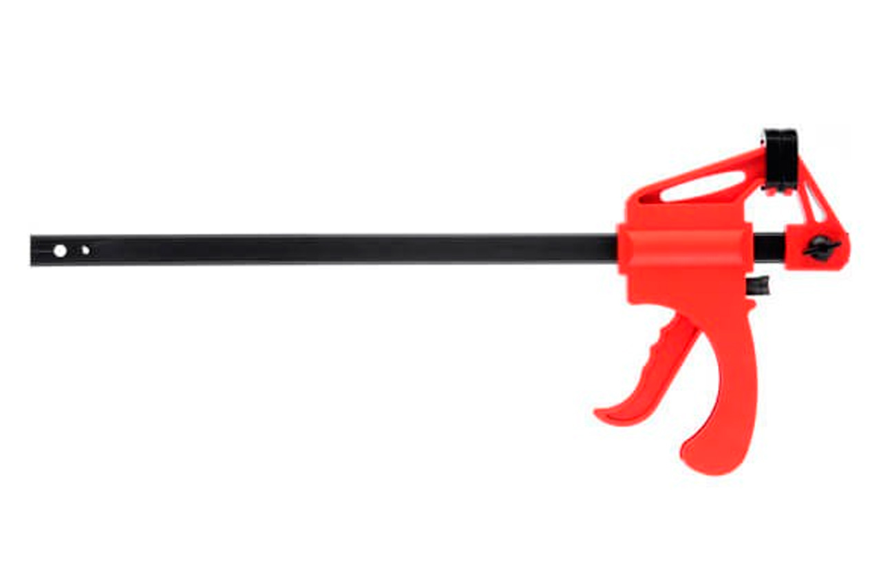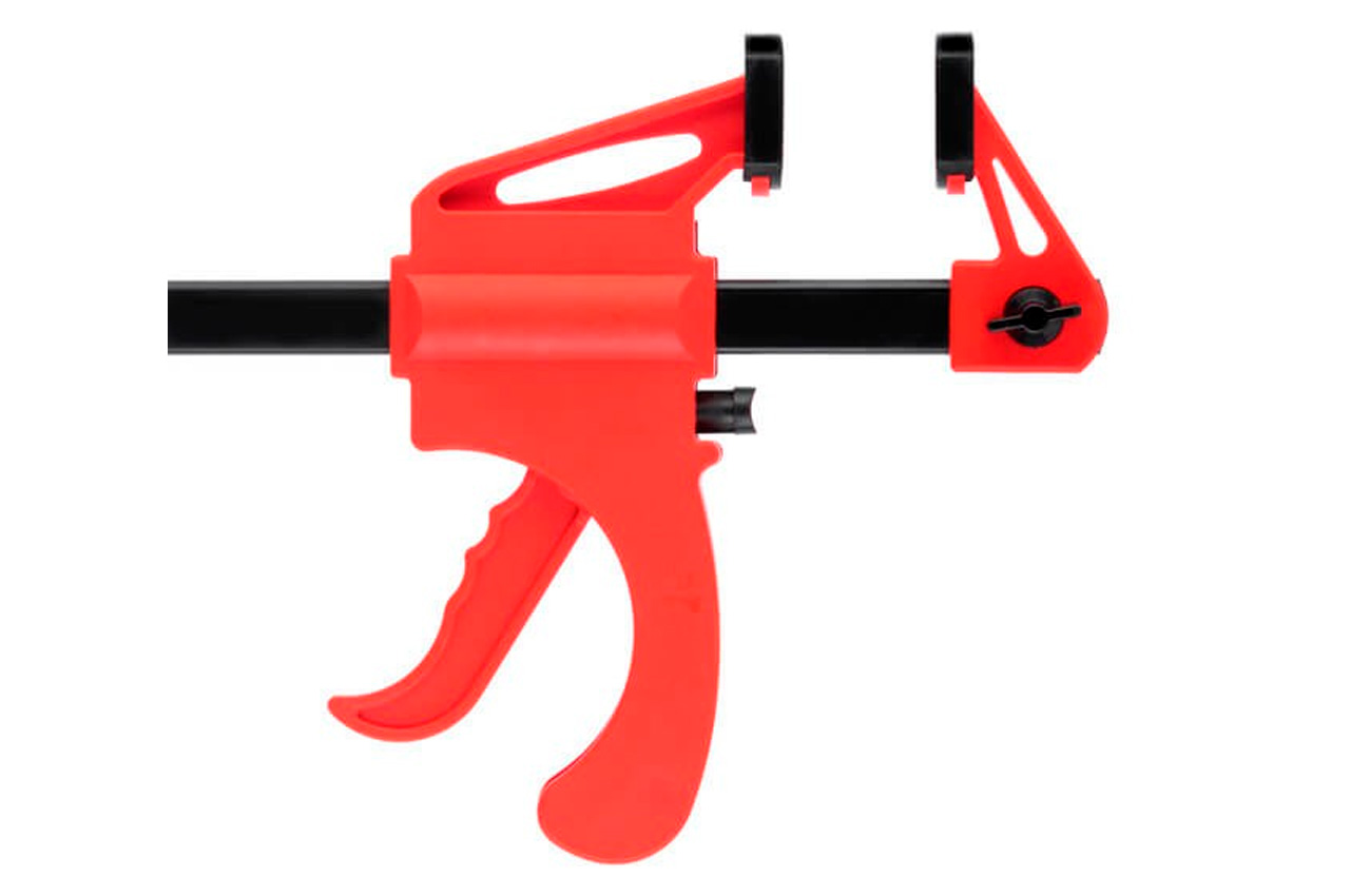 Струбцина з курковим механізмом затиску (зажим здійснюється шляхом натискання на курок). Напрямна виготовлена зі сталі, інші частини - з пластика. На затискають поверхнях є гумові накладки для запобігання пошкодження виробів при затиску. Розміри: 60x300 мм