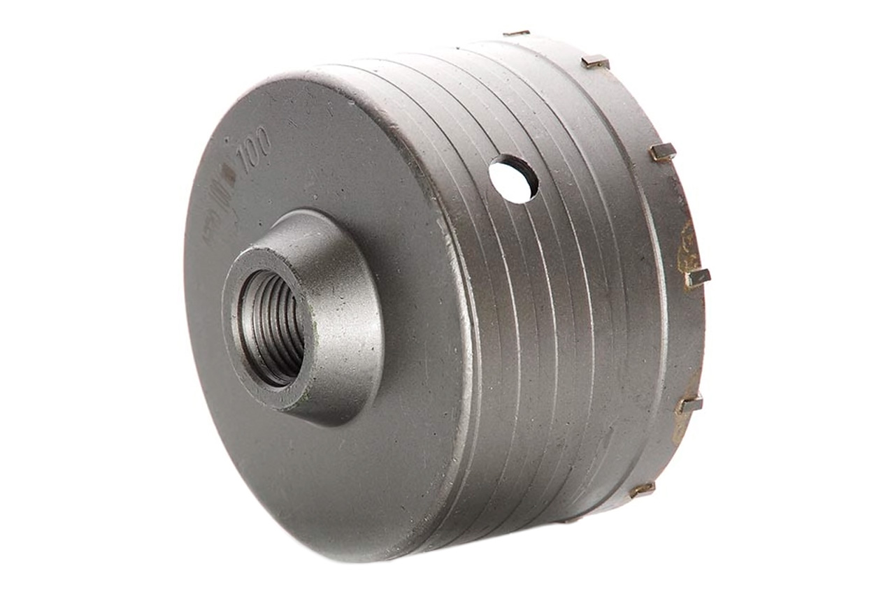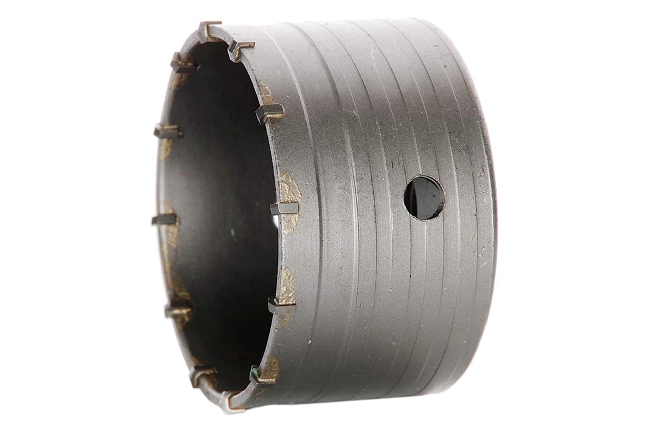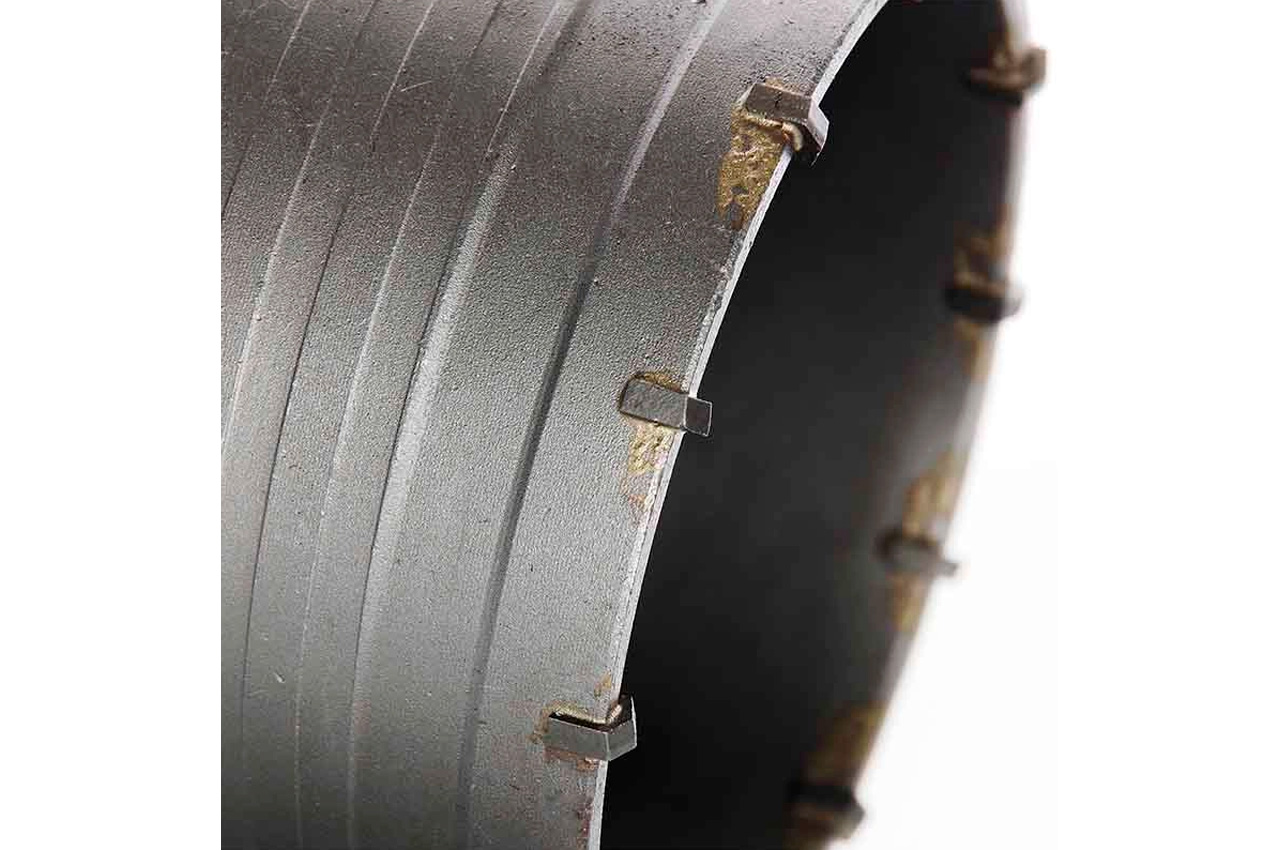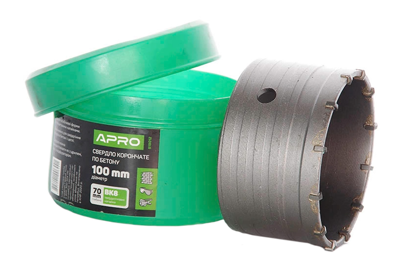 Свердло корончасте по бетону Apro застосовується для свердління великих отворів у бетоні, цегли, керамічній облицювальній плитці, граніті, гіпсових плитах. Зуби з твердого сплаву забезпечують швидке подрібнення матеріалу, що обробляється. Діаметр 100 мм.