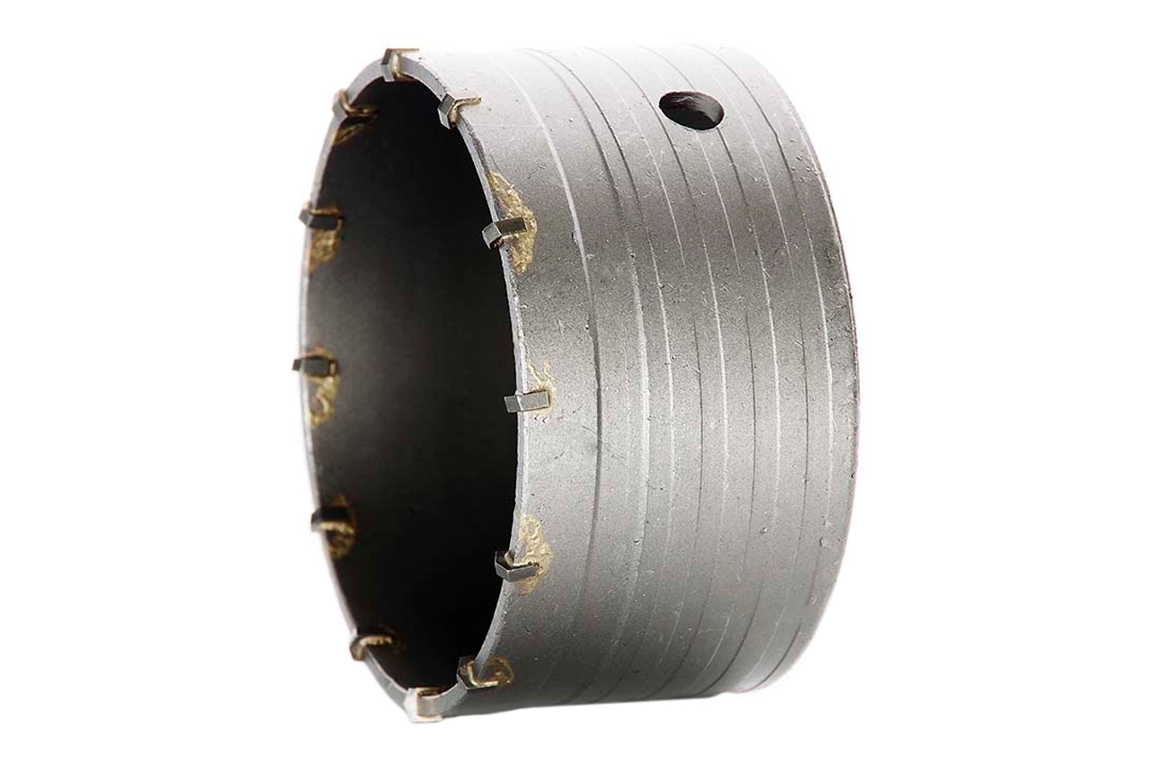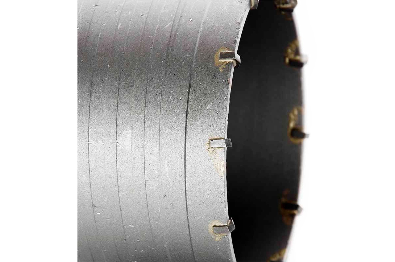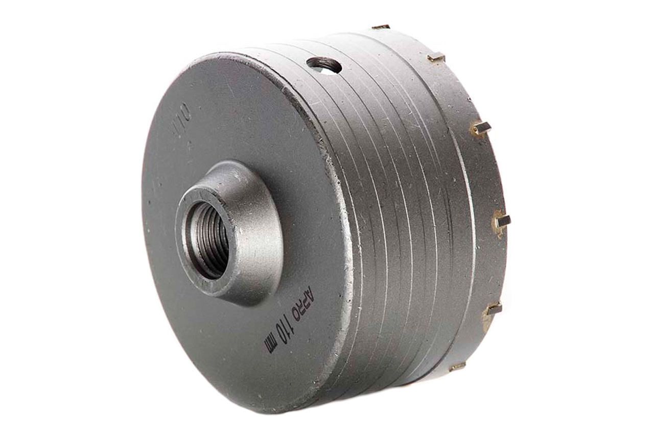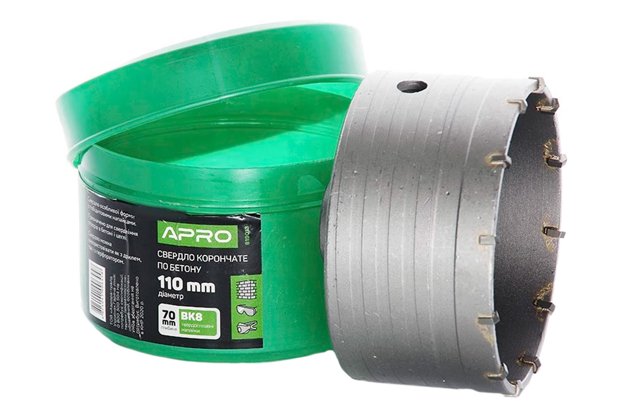 Свердло корончасте по бетону Apro застосовується для свердління великих отворів у бетоні, цегли, керамічній облицювальній плитці, граніті, гіпсових плитах. Зуби з твердого сплаву забезпечують швидке подрібнення матеріалу, що обробляється. Діаметр 110 мм.