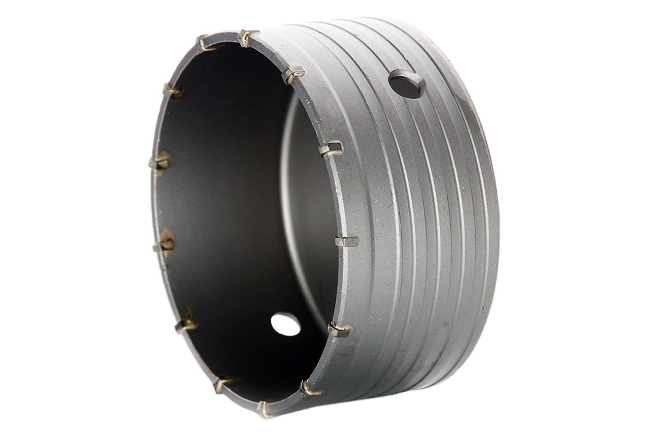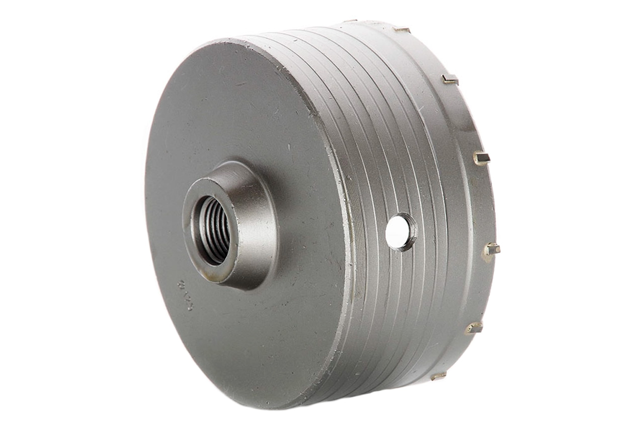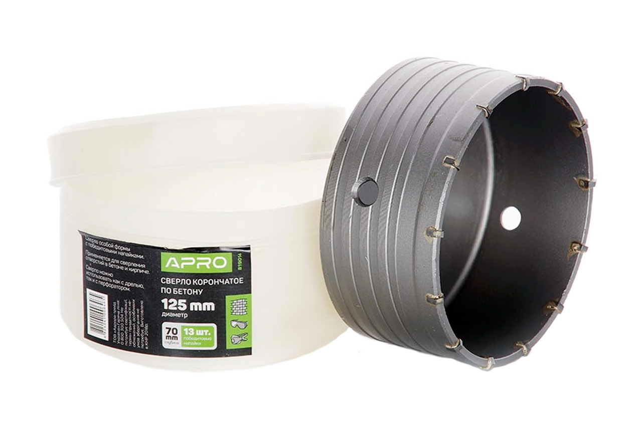 Свердло корончасте по бетону Apro застосовується для свердління великих отворів у бетоні, цегли, керамічній облицювальній плитці, граніті, гіпсових плитах. Зуби з твердого сплаву забезпечують швидке подрібнення матеріалу, що обробляється. Діаметр 125 мм.