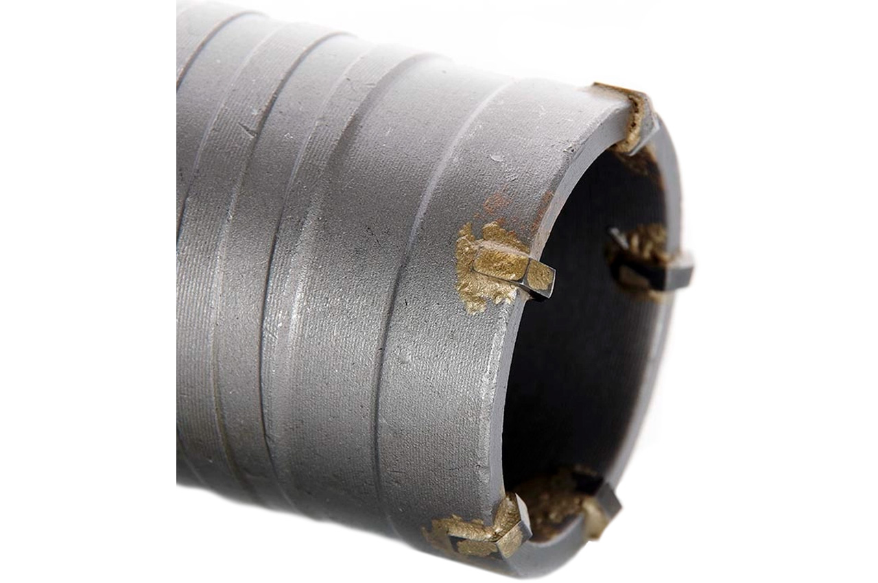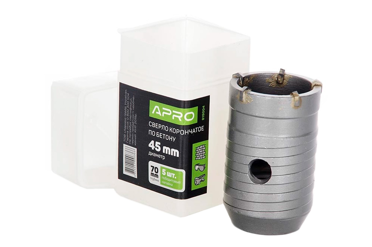Свердло корончасте по бетону Apro застосовується для свердління великих отворів у бетоні, цегли, керамічній облицювальній плитці, граніті, гіпсових плитах. Зуби з твердого сплаву забезпечують швидке подрібнення матеріалу, що обробляється. Діаметр 45 мм.