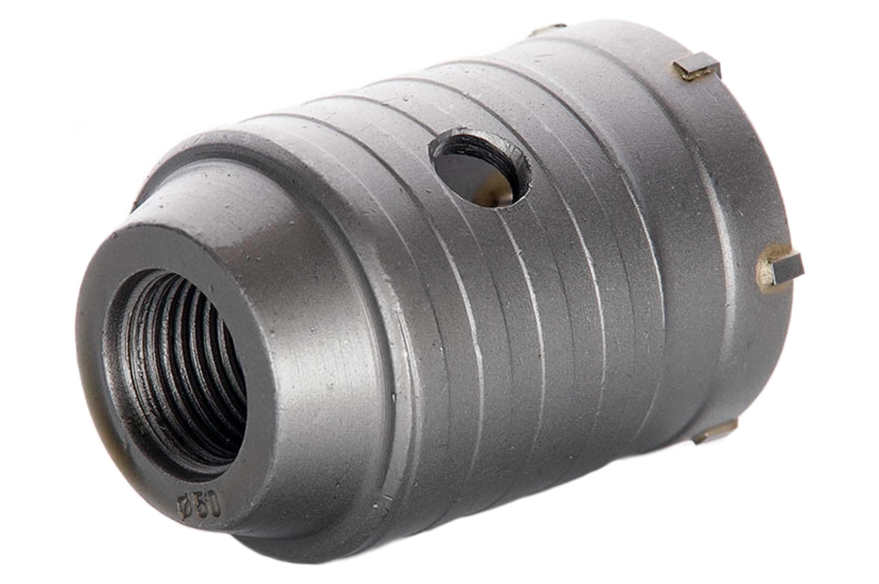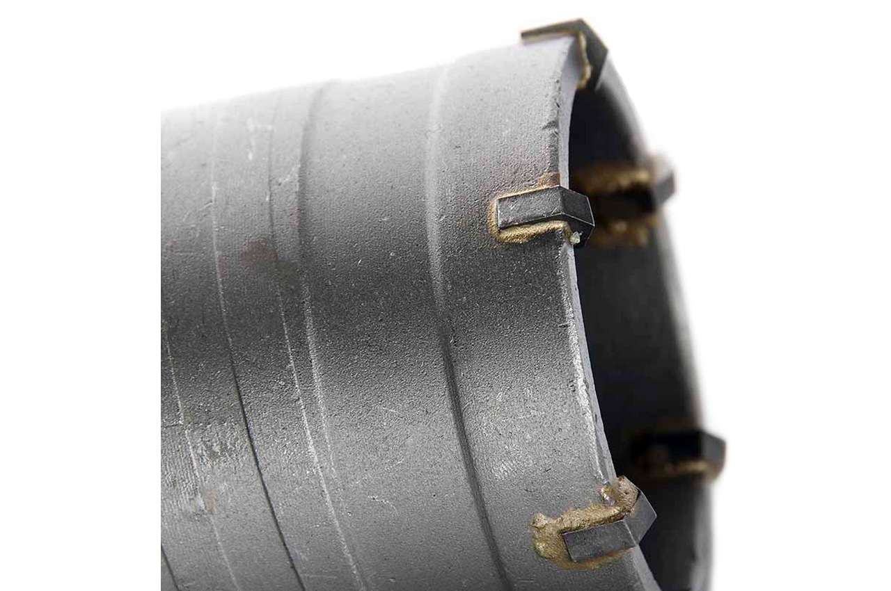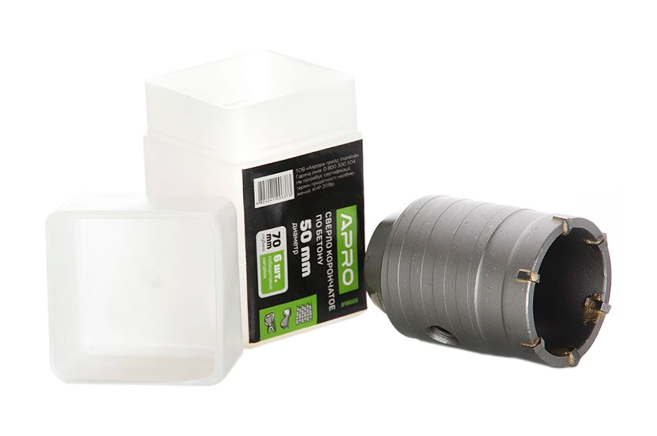Свердло корончасте по бетону Apro застосовується для свердління великих отворів у бетоні, цегли, керамічній облицювальній плитці, граніті, гіпсових плитах. Зуби з твердого сплаву забезпечують швидке подрібнення матеріалу, що обробляється. Діаметр 50 мм.