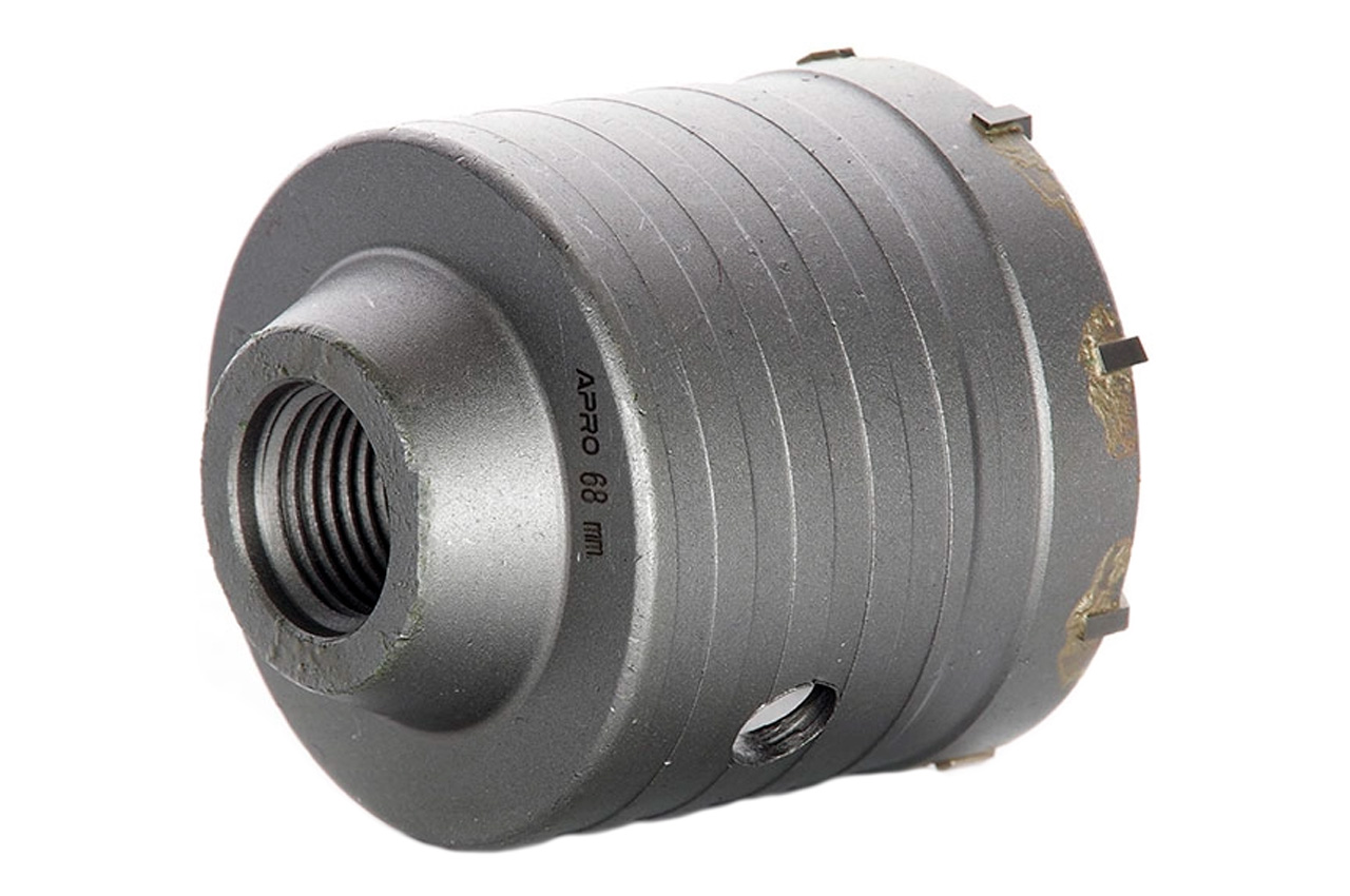 Свердло корончасте по бетону Apro застосовується для свердління великих отворів у бетоні, цегли, керамічній облицювальній плитці, граніті, гіпсових плитах. Зуби з твердого сплаву забезпечують швидке подрібнення матеріалу, що обробляється. Діаметр 68 мм.