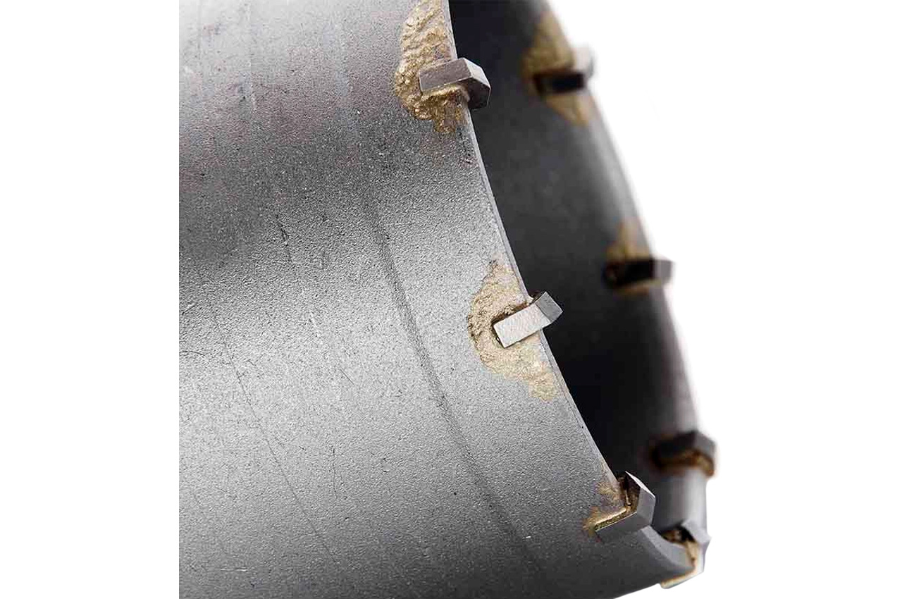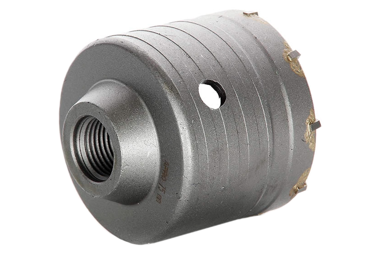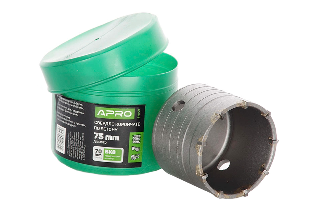Свердло корончасте по бетону Apro застосовується для свердління великих отворів у бетоні, цегли, керамічній облицювальній плитці, граніті, гіпсових плитах. Зуби з твердого сплаву забезпечують швидке подрібнення матеріалу, що обробляється. Діаметр 75 мм.