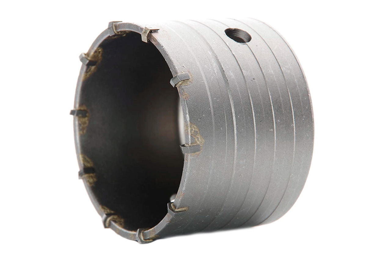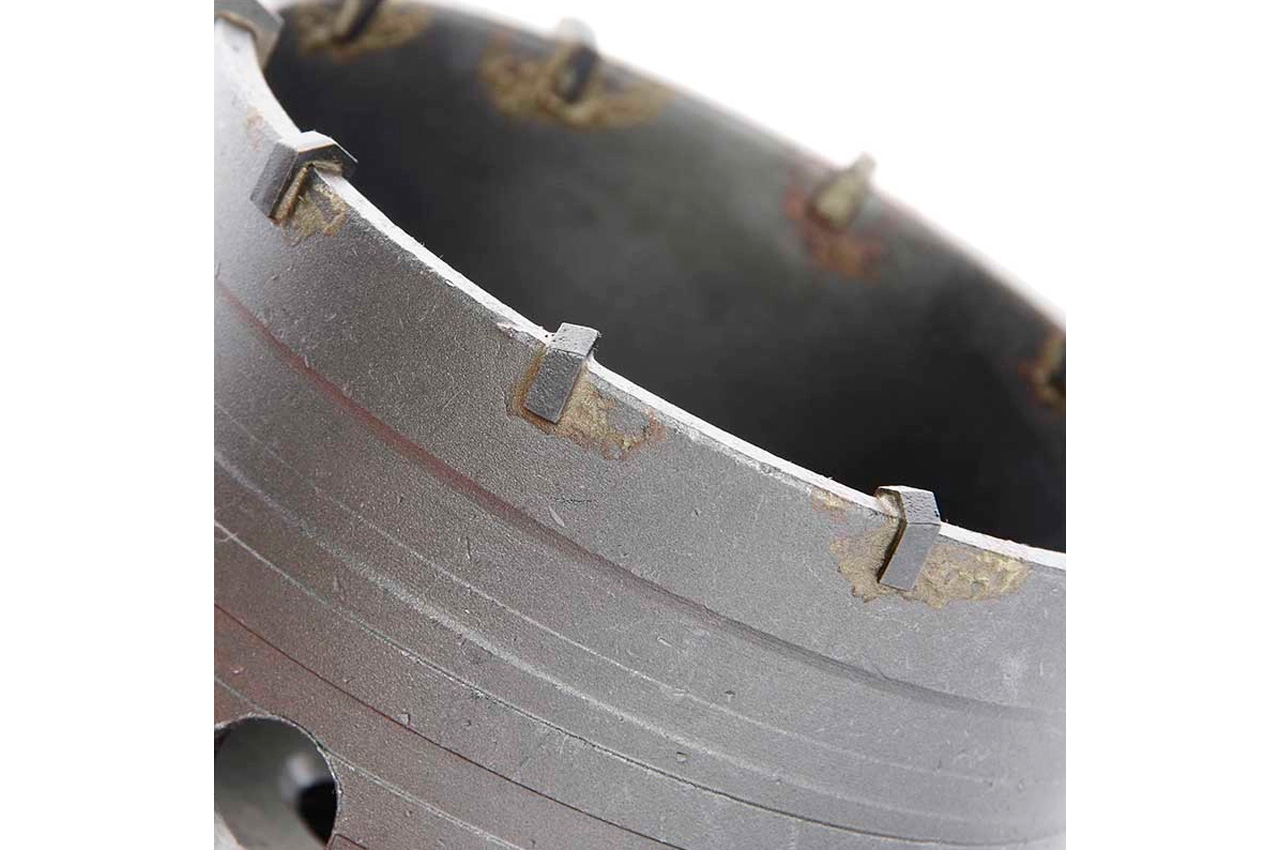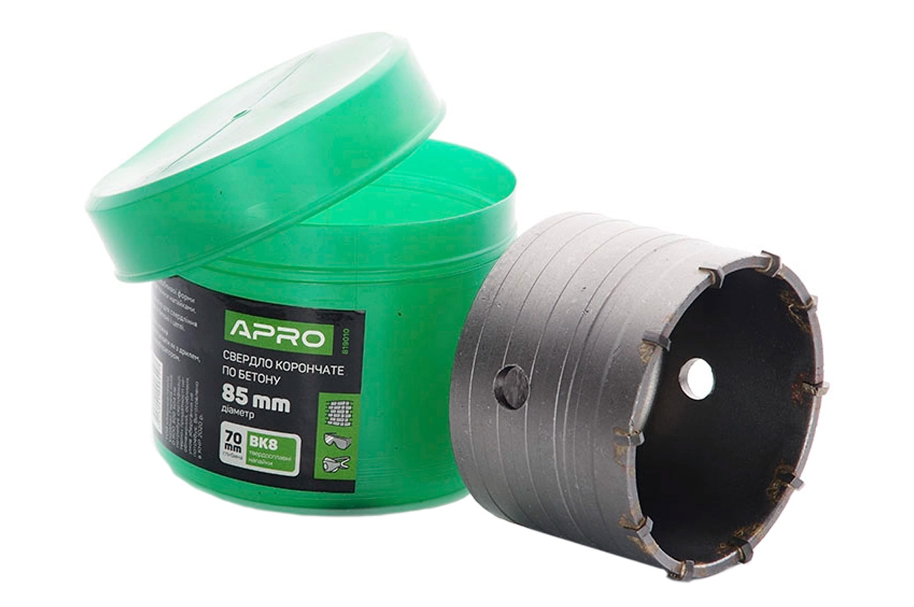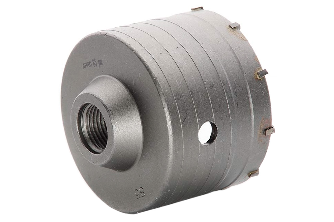 Свердло корончасте по бетону Apro застосовується для свердління великих отворів у бетоні, цегли, керамічній облицювальній плитці, граніті, гіпсових плитах. Зуби з твердого сплаву забезпечують швидке подрібнення матеріалу, що обробляється. Діаметр 85 мм.