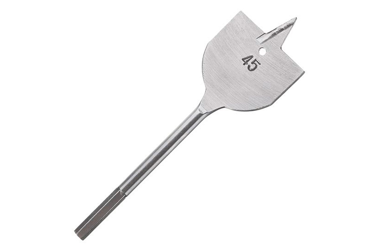 Перове свердло призначене для свердління отворів як в твердих, так і в м'яких матеріалах, ідеально підходить для свердління дерева, ДВП, ДСП, МДФ та фанери. Діаметр свердління - 45 мм, довжина свердла - 150 мм.