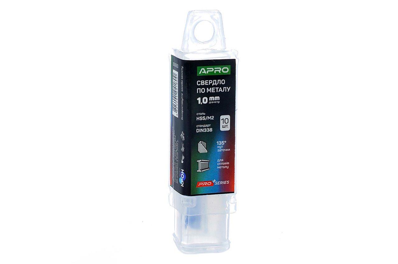 Свердло по металу Apro - призначене для свердління отворів у металевих матеріалах, включаючи сталь, чавун, алюміній та інші сплави. Діаметр 1,0 мм; Швидкорізальна сталь марки М2.